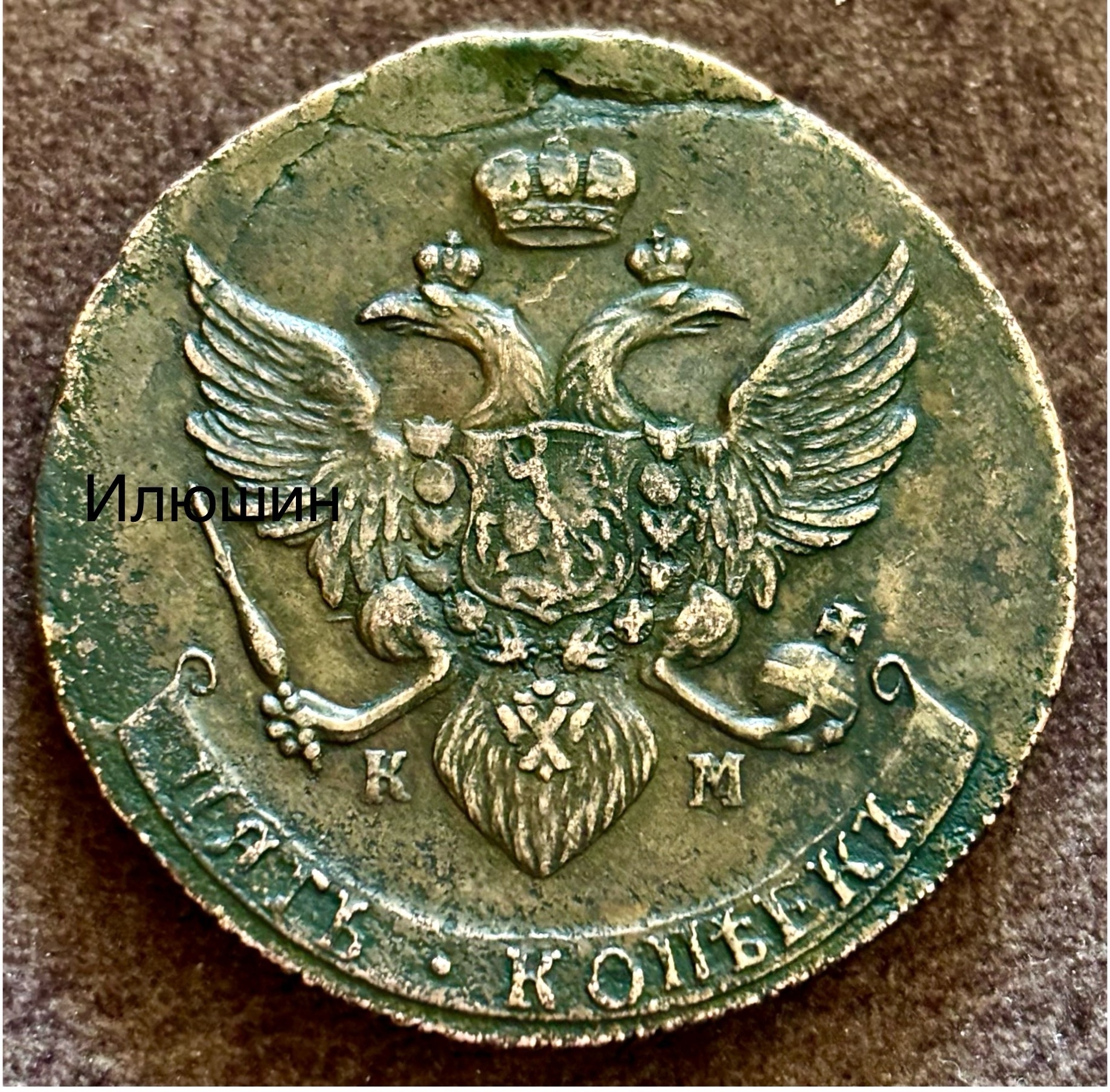 Медная монета номиналом 5 копеек, отчеканенная в 1789 году в период правления императрицы Екатерины II. Это оригинальный экземпляр так называемых «сибирских» монет (КМ — Колыванская монета), которые чеканились из меди Колывано-Воскресенских заводов. Монета имеет историческую ценность как памятник денежного обращения Российской Империи.