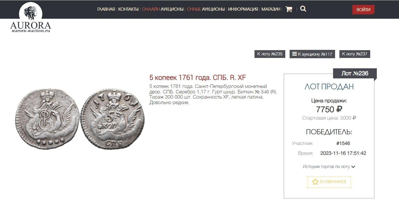 5 копеек 1761 года СПБ — поддельная монета Елизаветы Петровны
