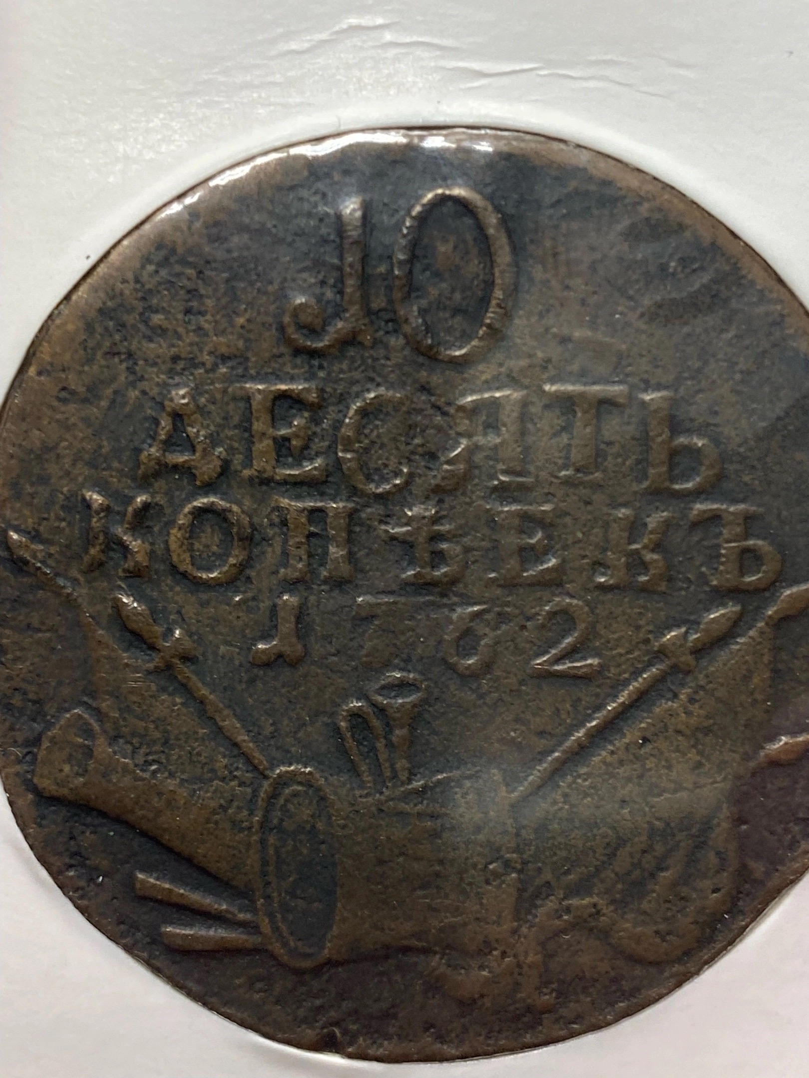 Монета номиналом 10 копеек, отчеканенная в 1762 году в краткое правление императора Петра III. Подлинные экземпляры этого периода редки и имеют высокую коллекционную ценность. Представленный на фото экземпляр, судя по консенсусу мнений опытных нумизматов, является фейком, вероятно, современной литой копией низкого качества.