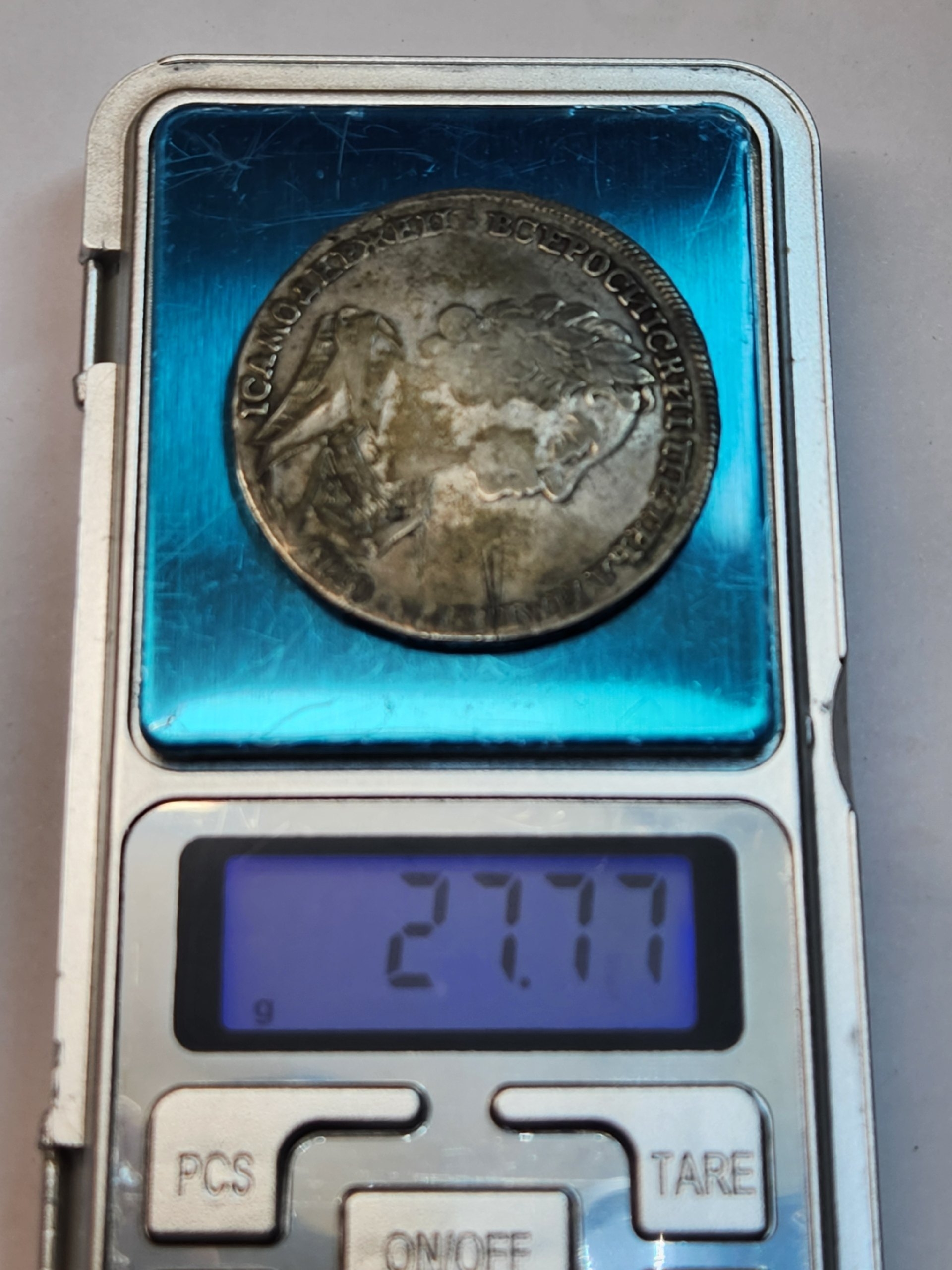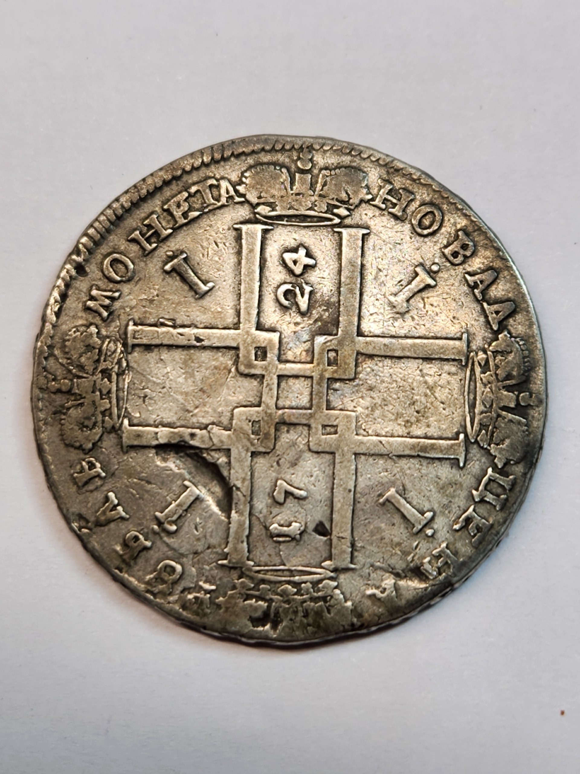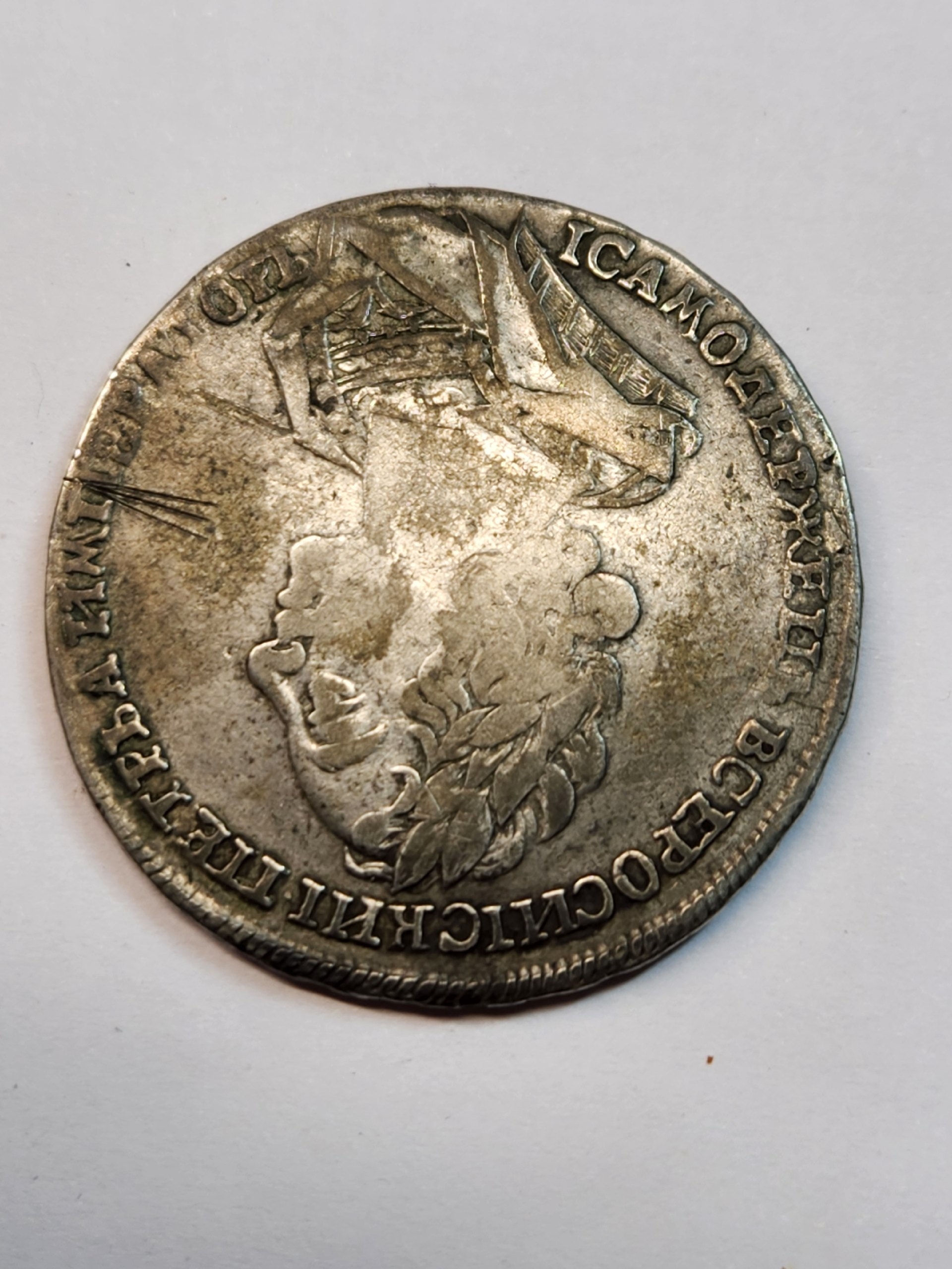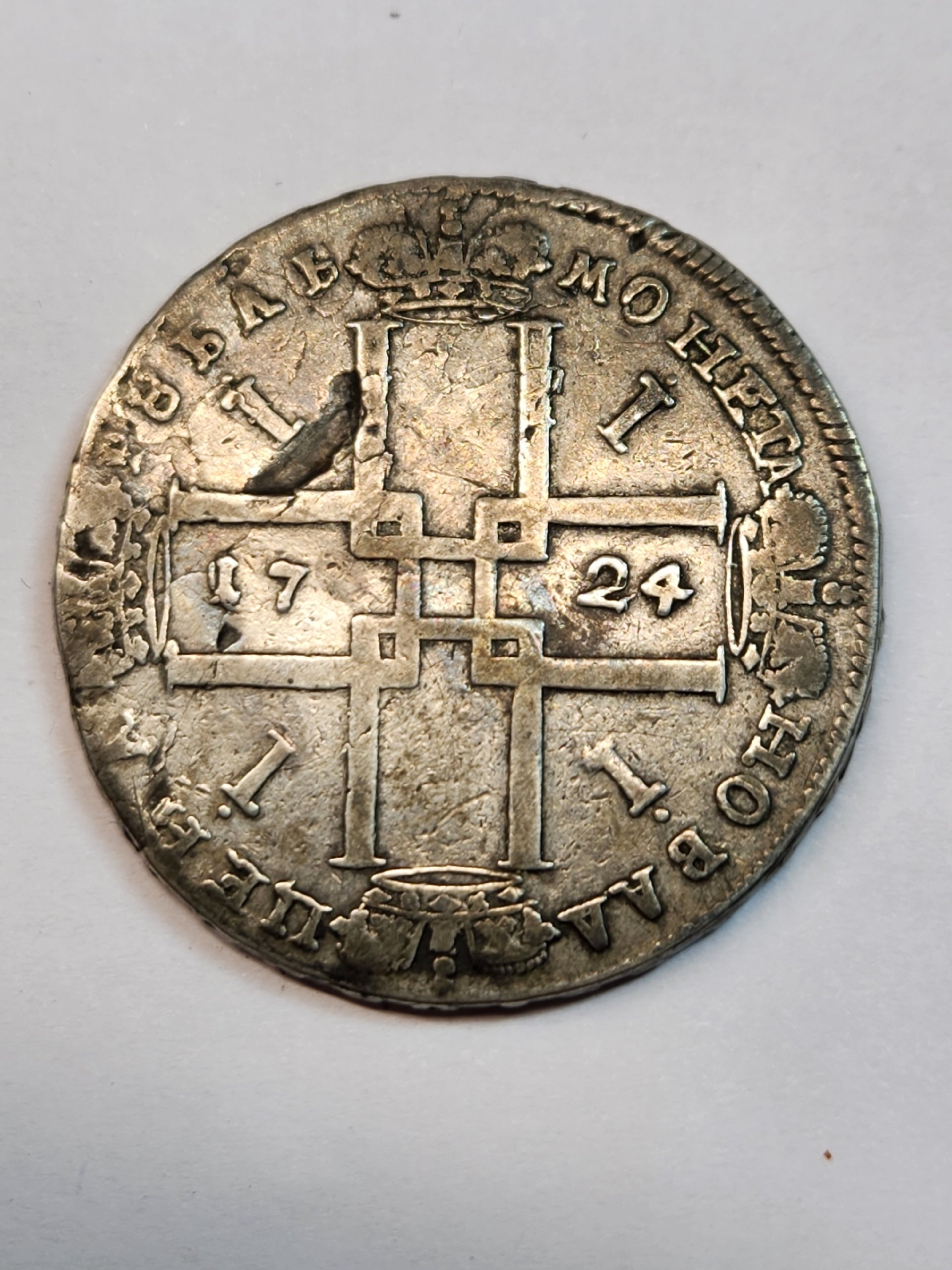 Серебряный рубль 1724 года, отчеканенный в правление Петра I. Монета относится к периоду денежной реформы и имеет высокую историческую ценность. Большинство экспертов в обсуждении признали её подлинной, отметив характерные детали портрета и естественные следы обращения.