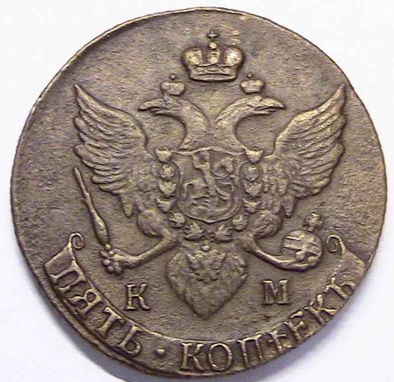 Монета номиналом 5 копеек 1792 года с вензелем Екатерины II (ЕМ) отчеканена из меди. Данный экземпляр является копией, о чём прямо указано в описании поста. Оригинальные монеты этого типа чеканились на Екатеринбургском монетном дворе и имеют характерные признаки, которые у данной копии отсутствуют или искажены.