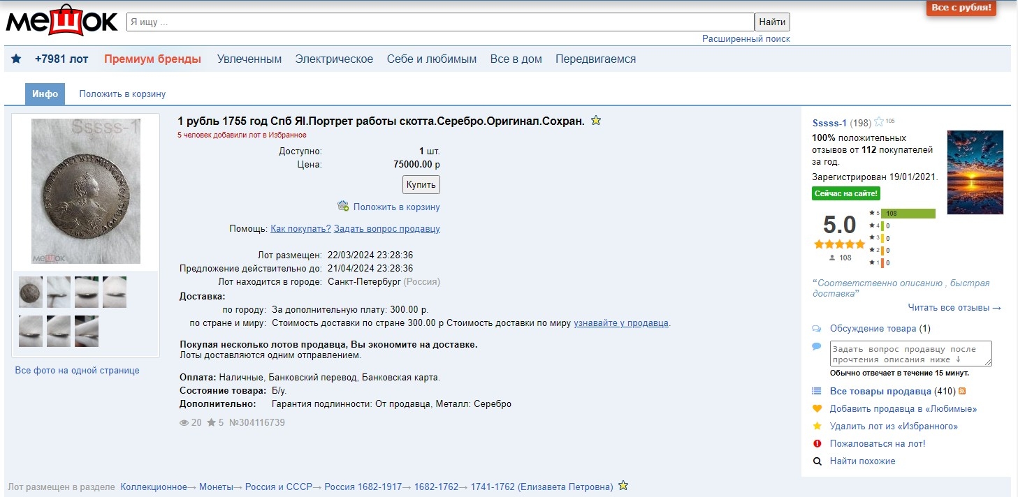 Монета представляет собой копию или подделку серебряного рубля 1755 года, отчеканенного при императрице Елизавете Петровне на Санкт-Петербургском монетном дворе (обозначение СПБ). Оригинальные рубли этого года с вензелем ЯI (инициалы минцмейстера Ивана Шлаттера) являются редкими и ценными, что делает их частой мишенью для фальсификаторов. Владелец поста и комментаторы прямо указывают на неоригинальность данного экземпляра.