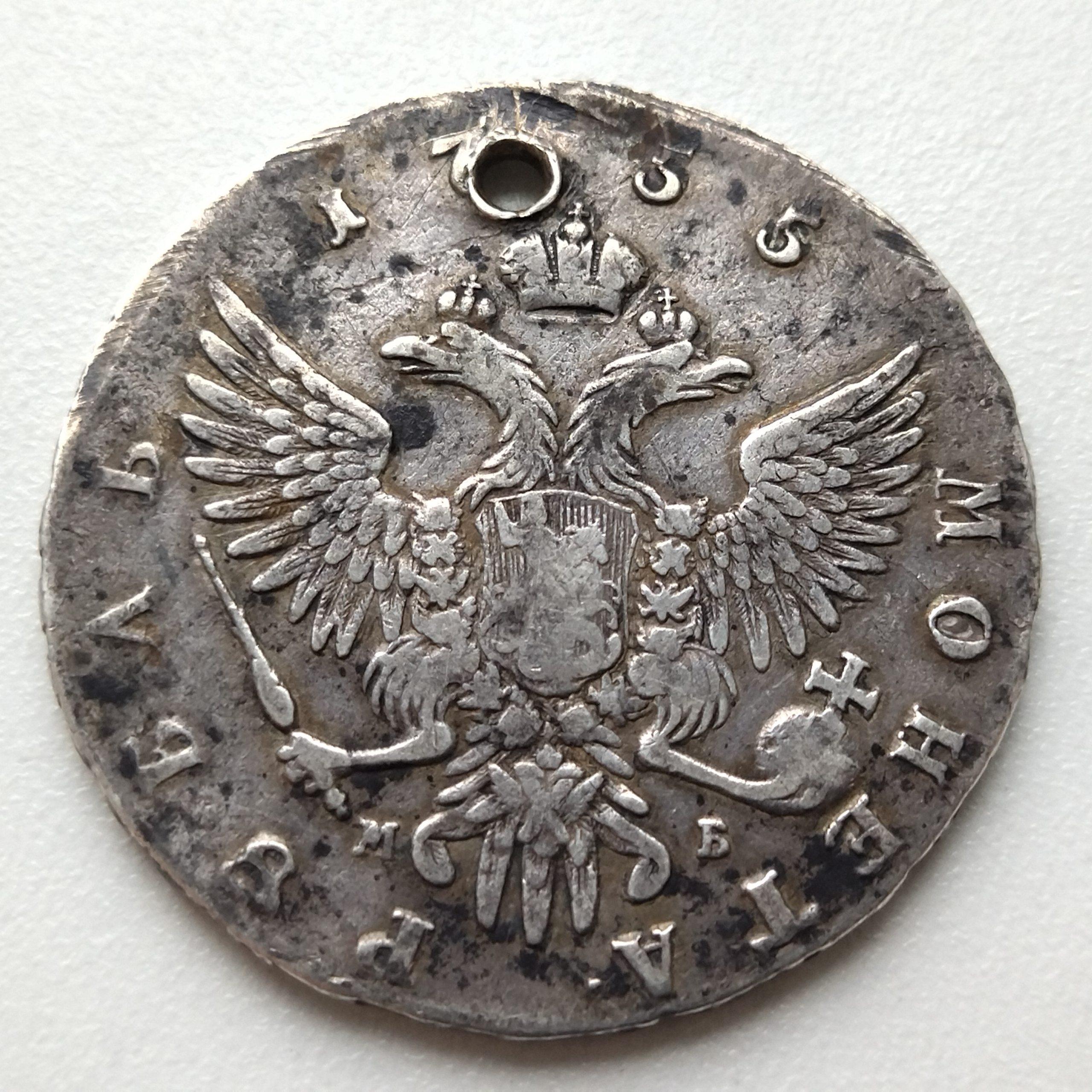 Серебряный рубль 1755 года, отчеканенный при императрице Елизавете Петровне на Московском монетном дворе (ММД). Монета является подлинным историческим артефактом, однако её коллекционную ценность значительно снижает пробитое в прошлом отверстие. Такие повреждения характерны для монет, которые использовались в качестве украшения или оберега.