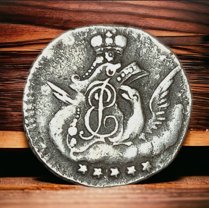 Медная монета 5 копеек 1761 года, отчеканенная в период правления императрицы Елизаветы Петровны. Представленный экземпляр является распространённой подделкой, неоднократно опознанной экспертами. Её выдают несоответствующие оригиналу вес и диаметр, а также характерные ошибки в деталях изображения.