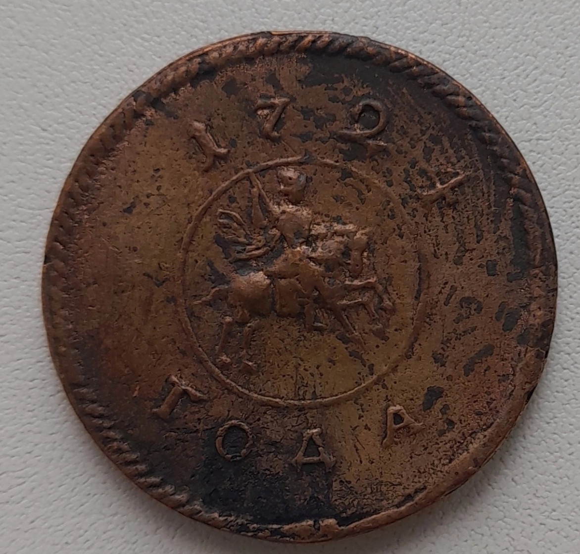 Медная копейка 1724 года, отчеканенная в период правления Петра I. В оригинале это монета квадратной формы («чешуйка»), выпускавшаяся в рамках денежной реформы. В данном случае представлена откровенная подделка, о чём прямо указано в описании поста.