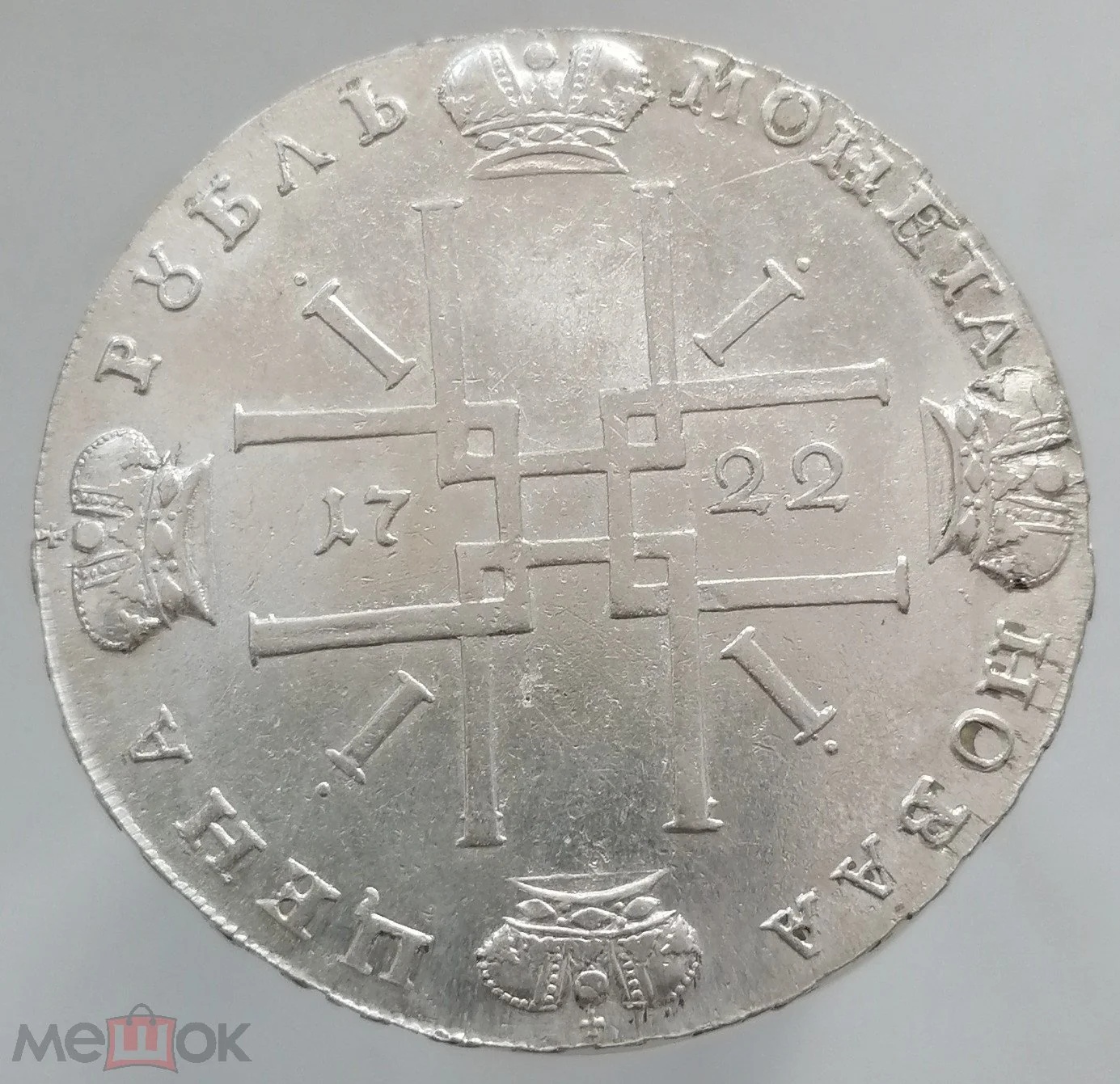 Монета представляет собой копию серебряного рубля 1722 года, отчеканенного в период правления Петра I. Оригинальные рубли этого года имеют высокую коллекционную ценность и встречаются редко. В посте автор прямо указывает, что это копия, что делает её современной репликой, не имеющей нумизматической ценности.