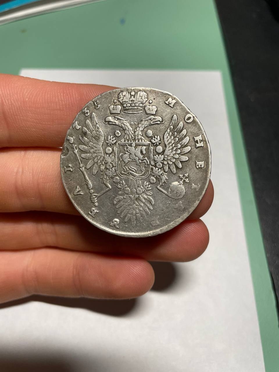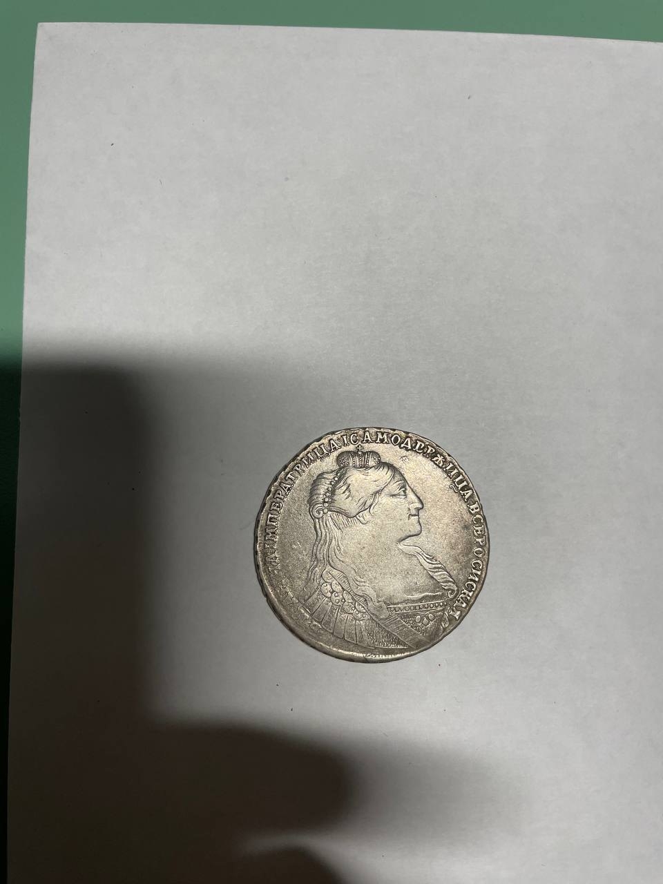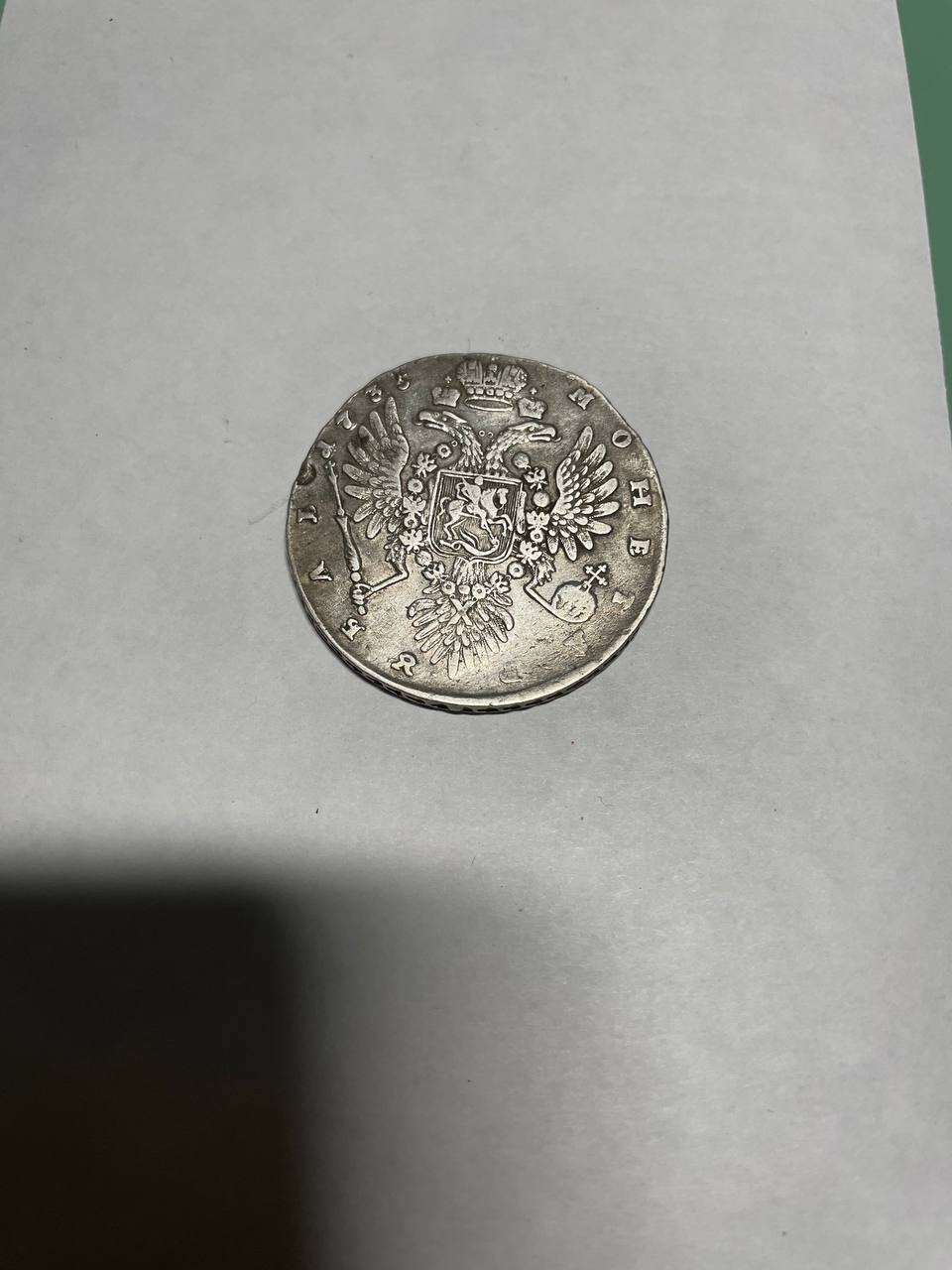 Серебряный рубль 1735 года, отчеканенный в правление императрицы Анны Иоанновны. Монета имеет характерный портрет императрицы в жемчужном уборе и гербового орла на реверсе. Большинство экспертов в обсуждении признали её подлинной, отметив хорошее состояние (VF).