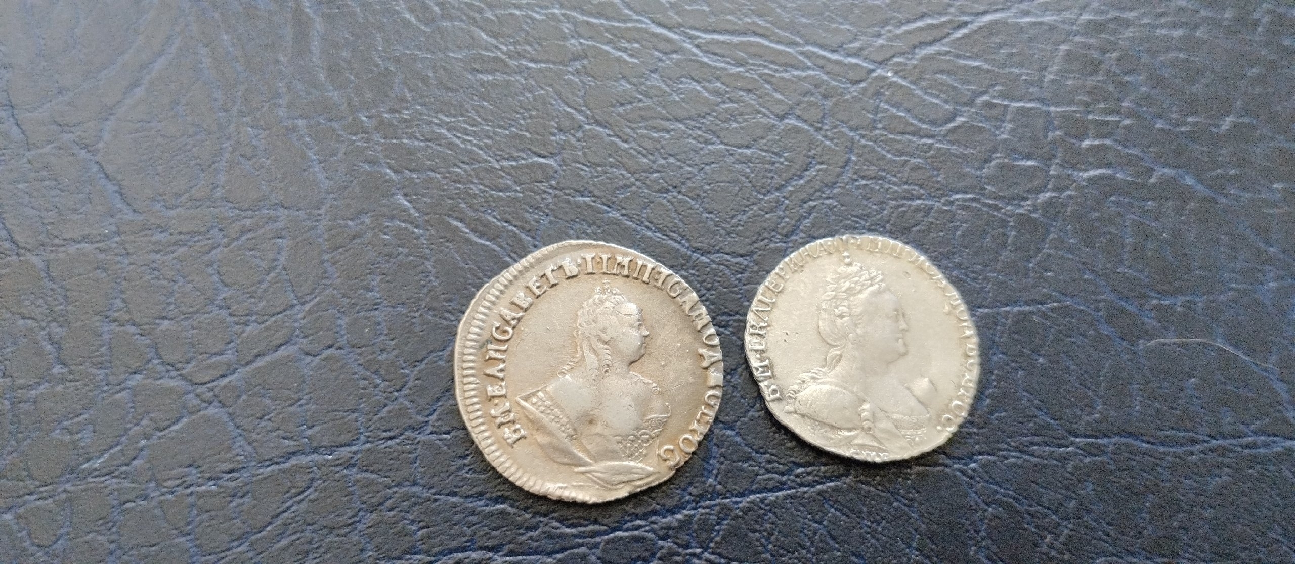 Монеты представлены как серебряные гривенники (10 копеек) времён правления императрицы Елизаветы Петровны (1756) и Екатерины II (1785). Однако, по мнению экспертов сообщества, обе монеты являются современными копиями низкого качества, отлитыми с одной мастер-модели («восковки»). Такие подделки часто имеют несоответствия в деталях и общий «мыльный» рельеф.