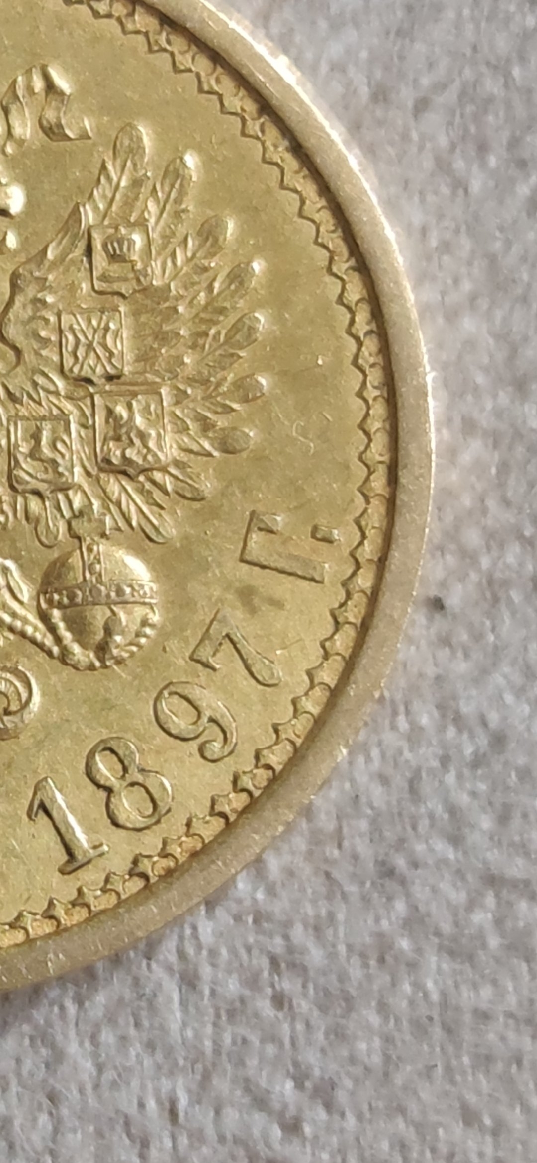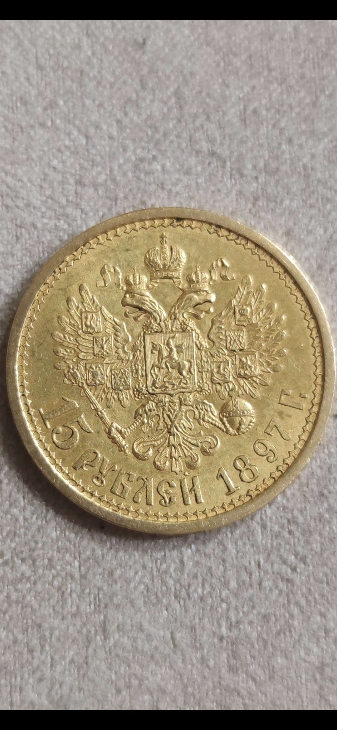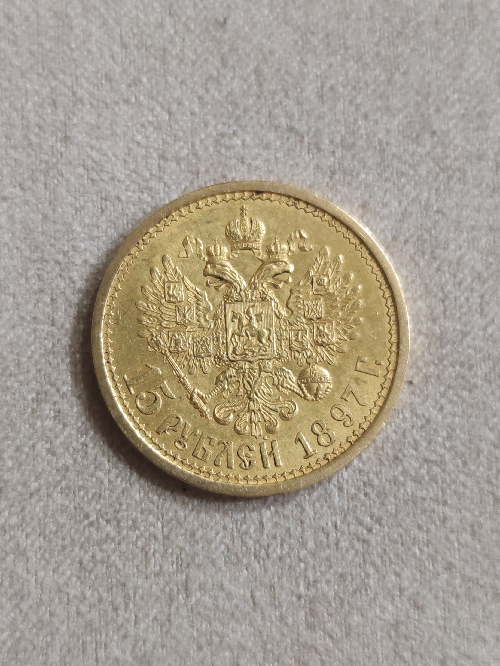 Монета номиналом 15 рублей 1897 года, отчеканенная при Николае II из золота, является современной подделкой. Её выдают многочисленные ошибки в деталях: искажённый портрет императора, неправильная форма буквы «Г» в слове «ГОДА», кривые цифры даты и неверно проработанные детали орла. Большинство экспертов в комментариях единодушно признали её фейком, указав на явные признаки литья или штамповки копии.