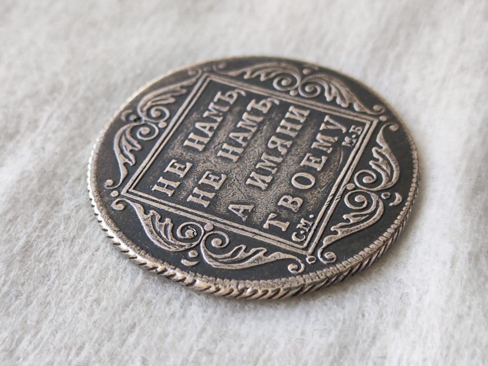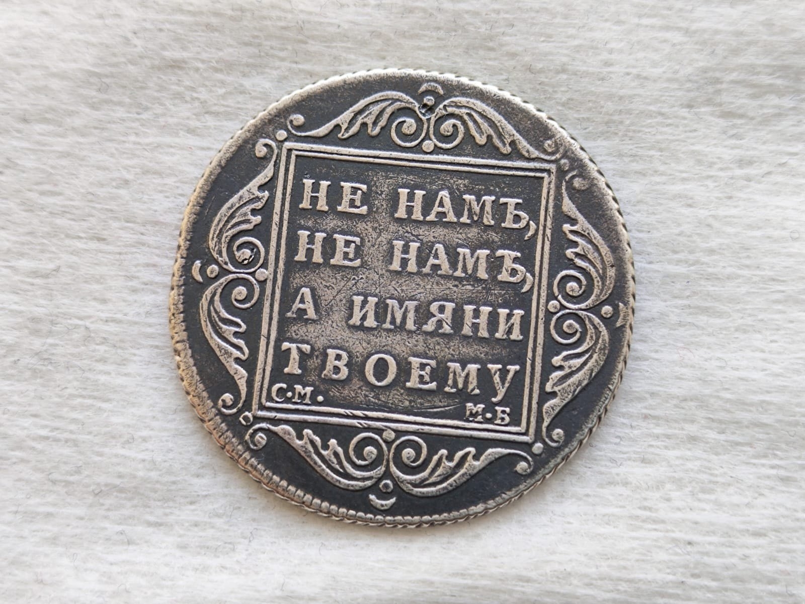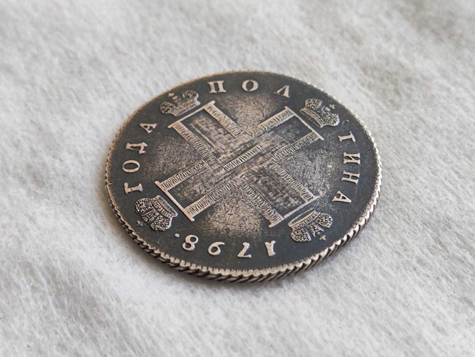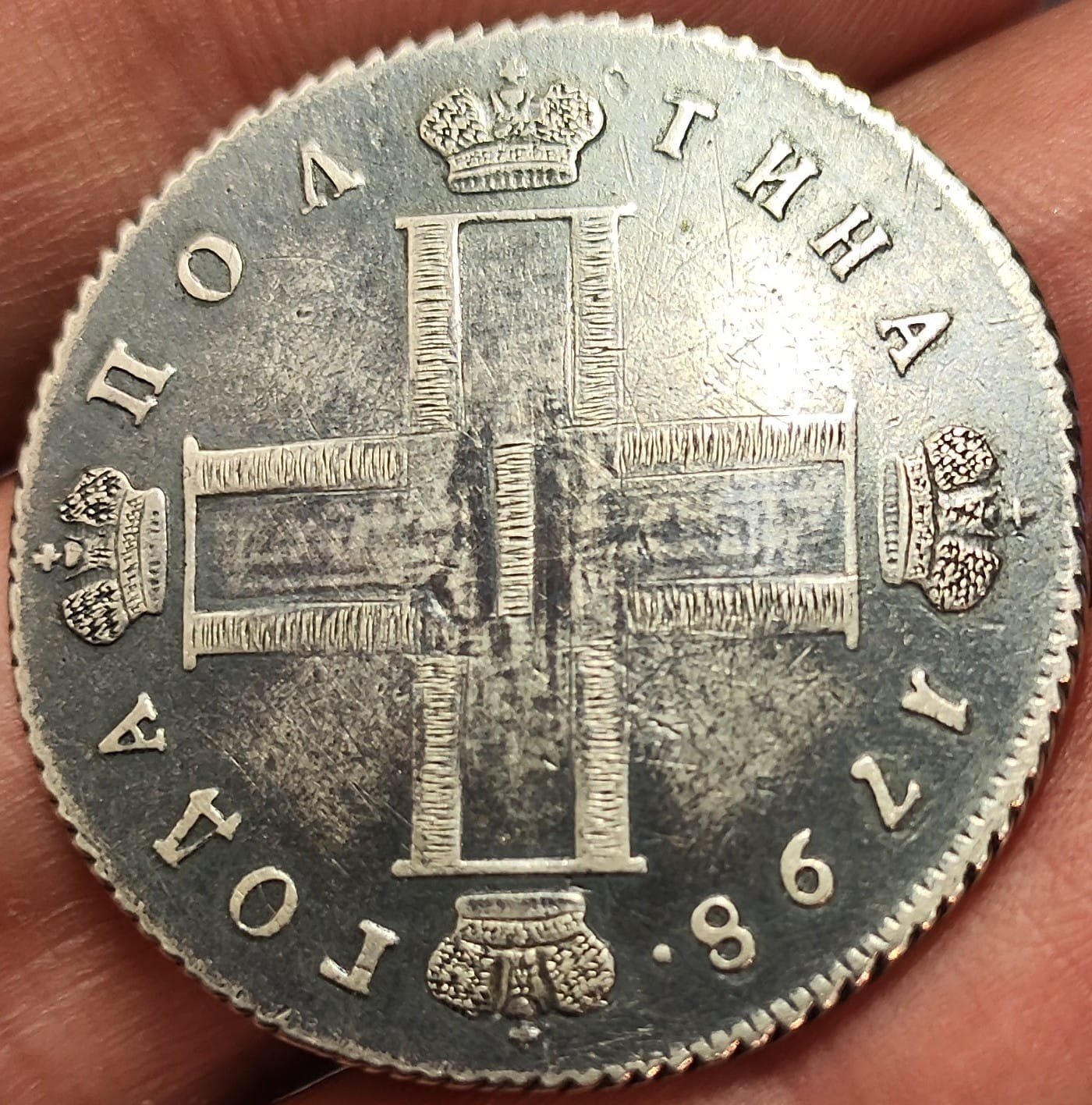 Серебряная полтина 1798 года, отчеканенная в правление императора Павла I. Монета является подлинной, однако имеет серьёзные дефекты в виде грубой доработки штихелем вензеля и корон, а также искусственно нанесённой патины. Эти вмешательства значительно снижают её коллекционную стоимость.