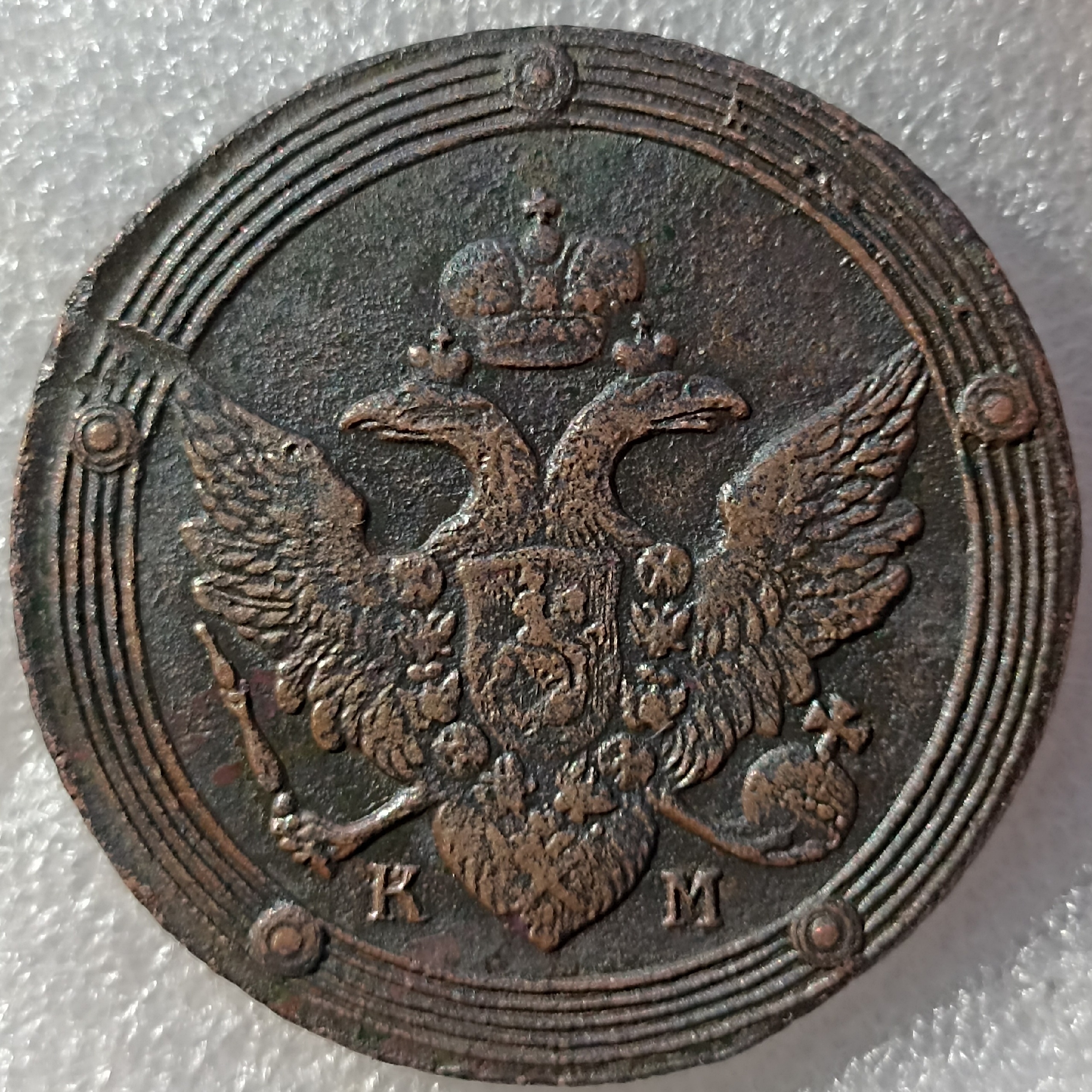 Медная монета номиналом 5 копеек, отчеканенная в период правления Александра I. Монеты данного типа выпускались на Екатеринбургском монетном дворе (обозначение «ЕМ»). Для точной атрибуции и определения подлинности требуются детальные фотографии аверса, реверса и гурта.
