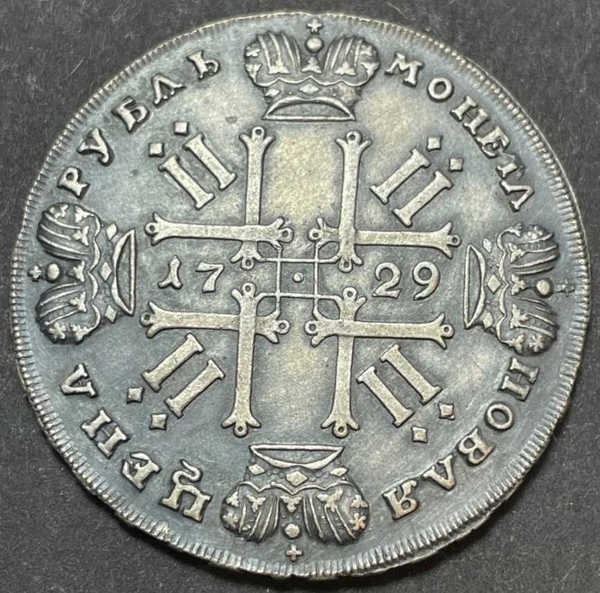 Монета представляет собой современную подделку рубля 1729 года, отчеканенного в период правления Петра II. Оригинальные рубли этого года имеют высокую коллекционную ценность и редки. Представленный экземпляр является искусно изготовленной копией, что подтверждается анализом специалистов.