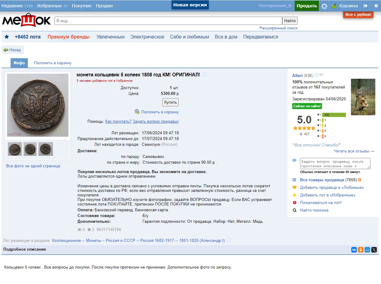 Медная монета номиналом 5 копеек 1808 года, отчеканенная в правление императора Александра I. В посте автор прямо указывает, что монета является подделкой. Несмотря на отсутствие развернутой аргументации в комментариях, исходное утверждение автора поста принимается как вердикт.
