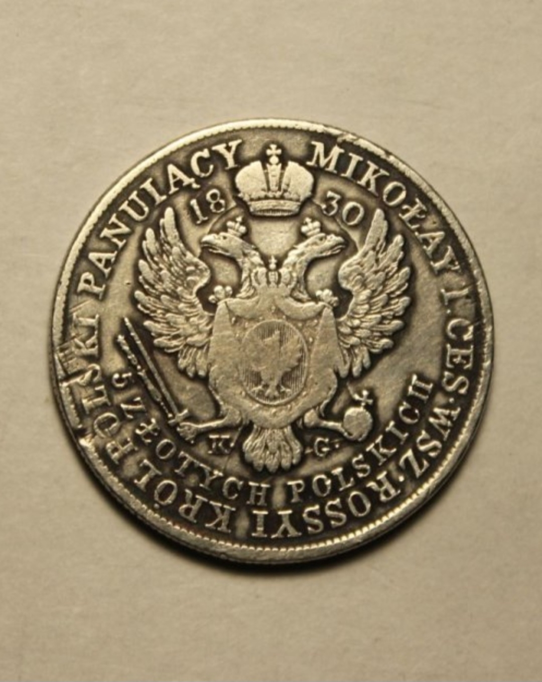 Монета 5 злотых 1830 года чеканилась в период правления Николая I на Варшавском монетном дворе. Представленный экземпляр является подделкой, о чём свидетельствуют характерные признаки литья: зализанность деталей гурта, соединённые буквы, искажённые элементы портрета и угловатая цифра 5 в дате.