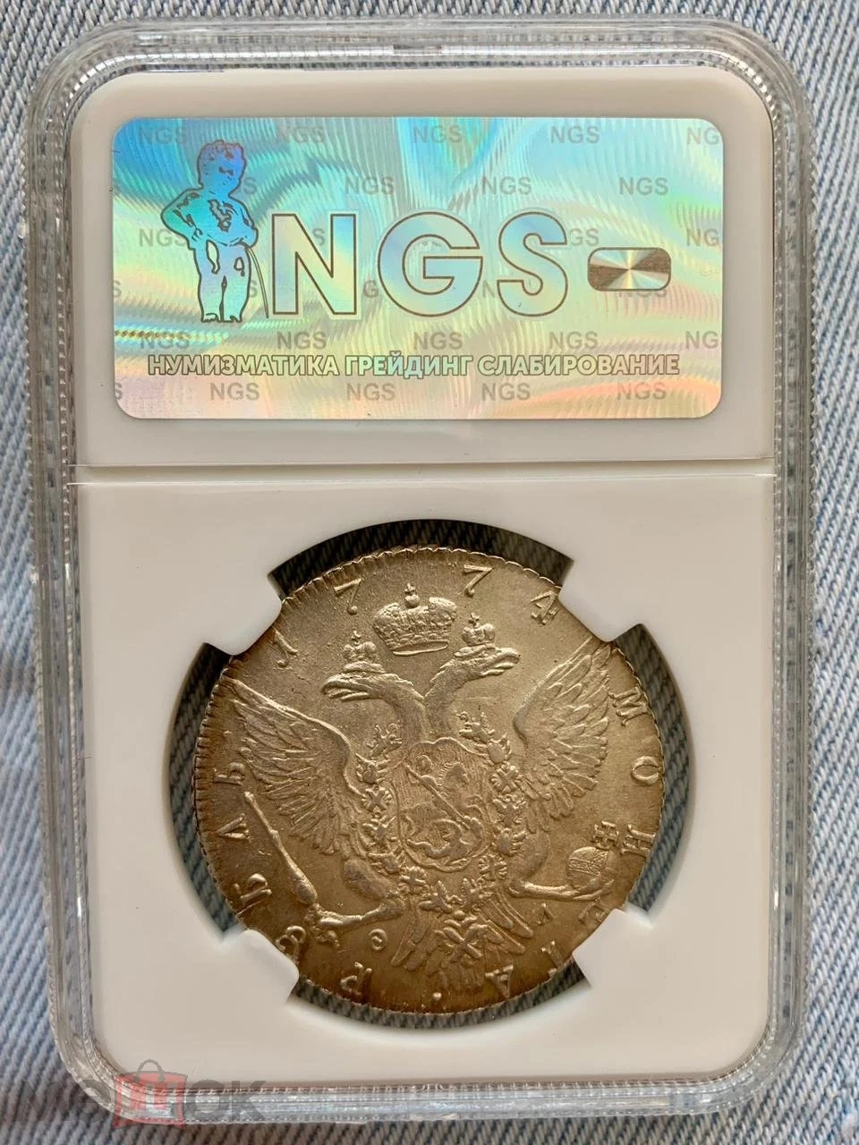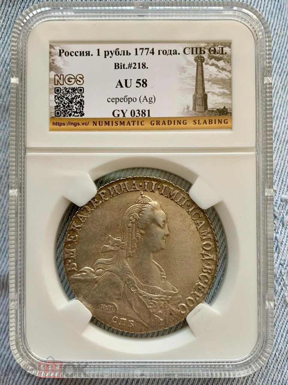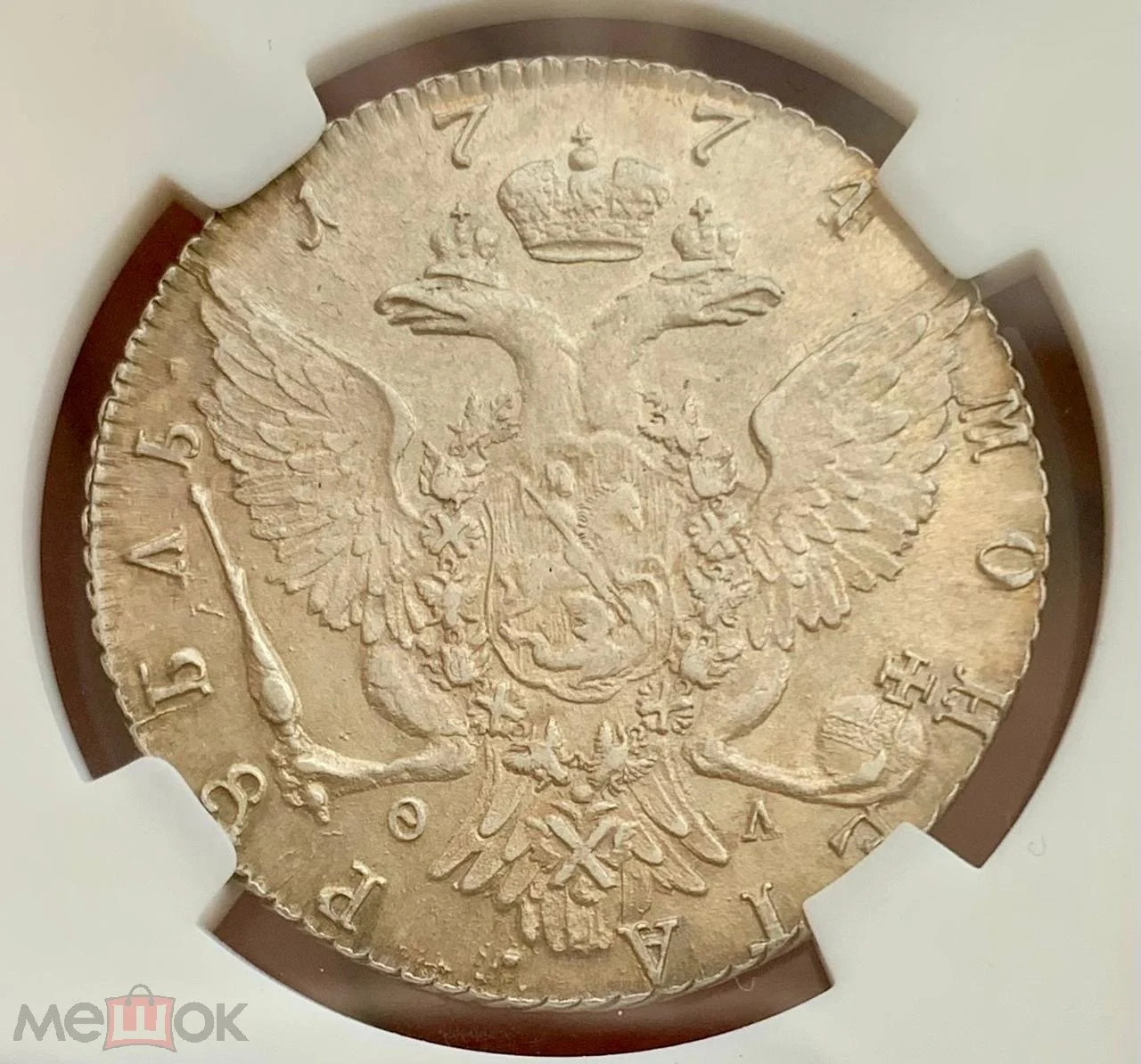 Серебряный рубль 1774 года с монограммой Екатерины II и буквами СПБ (Санкт-Петербургский монетный двор). Монета представлена как подделка, прошедшая сертификацию в грейдинговой компании NGS, что вызвало резонанс в нумизматическом сообществе. Это яркий пример высококачественной фальшивки, обманом попавшей в защитный слаб с формальной гарантией подлинности.