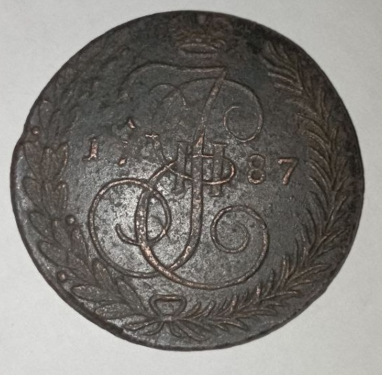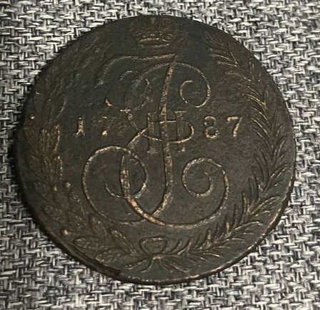 Монета номиналом 5 копеек 1787 года с вензелем Екатерины II (ТМ — Таврический монетный двор) является современной подделкой. Коллекционеры единогласно отмечают отсутствие признаков подлинности, грубые ошибки в деталях (например, в цифре вензеля и изображении крыльев орла). Такие экземпляры часто используются как учебные пособия для обучения определению фальшивок.