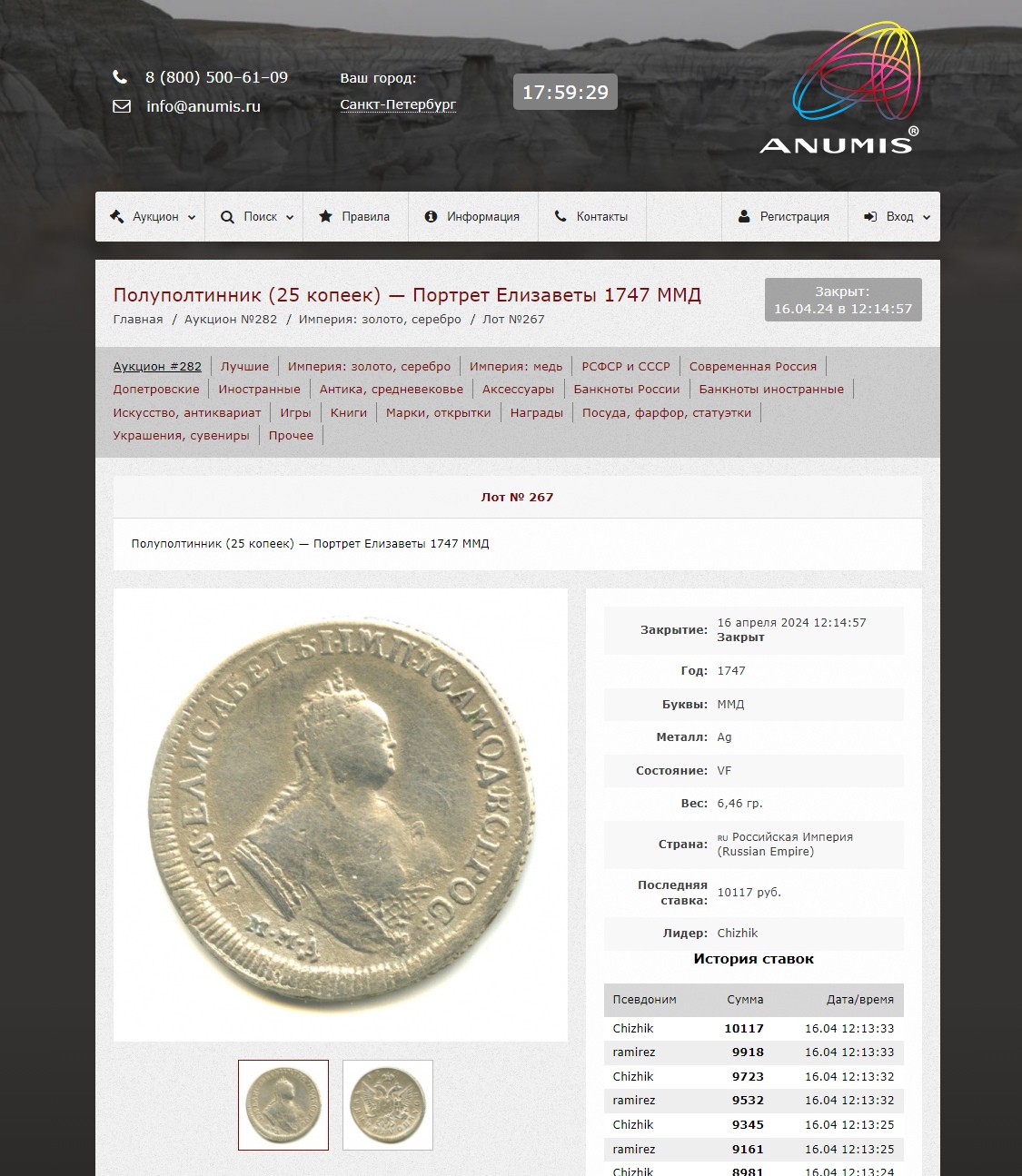 Монета представляет собой полуполтинник (25 копеек) 1747 года, отчеканенный при императрице Елизавете Петровне на Московском монетном дворе (ММД). Судя по консенсусу в комментариях, это современная подделка, отлитая в форме, о чём свидетельствуют явные следы литья. Подобные копии часто встречаются на рынке и не имеют коллекционной ценности.