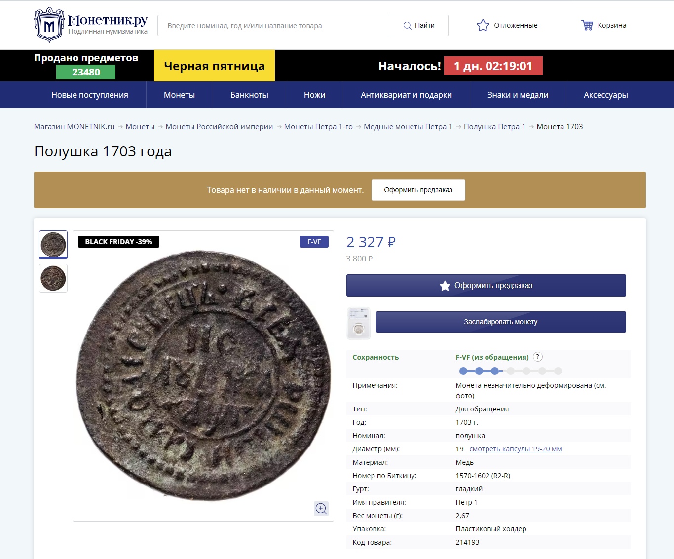 Полушка 1703 года Петра I — грубая современная подделка