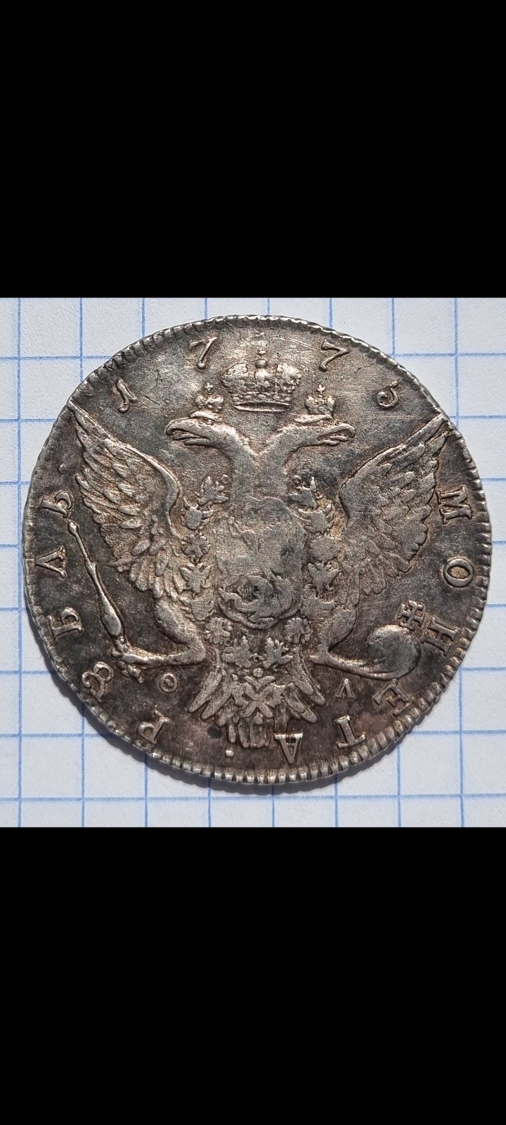 Серебряный рубль 1775 года, отчеканенный в период правления императрицы Екатерины II. Монета имеет стандартные параметры для данного типа: вес около 24 граммов, диаметр примерно 38 мм. Комментарии опытных коллекционеров в обсуждении указывают на её подлинность и оценивают сохранность.