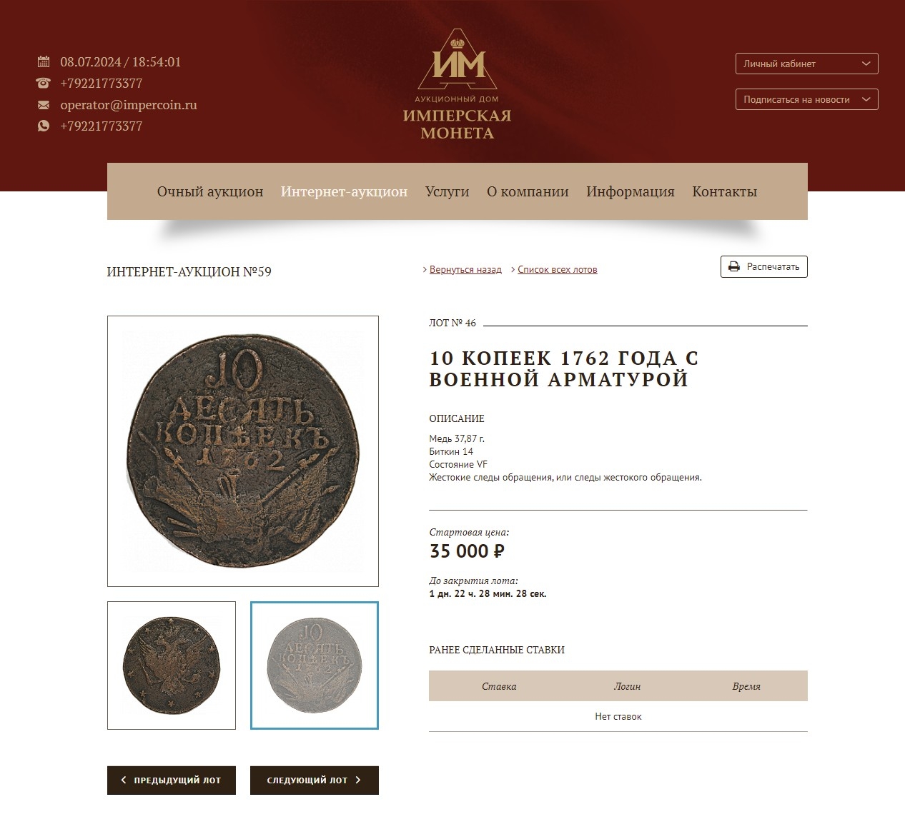 Монета номиналом 10 копеек, отчеканенная в 1762 году в правление императора Петра III. Данный экземпляр является подделкой, о чём прямо указано в описании поста. Подлинные серебряные 10 копеек этого периода представляют значительную нумизматическую ценность и являются редкими.