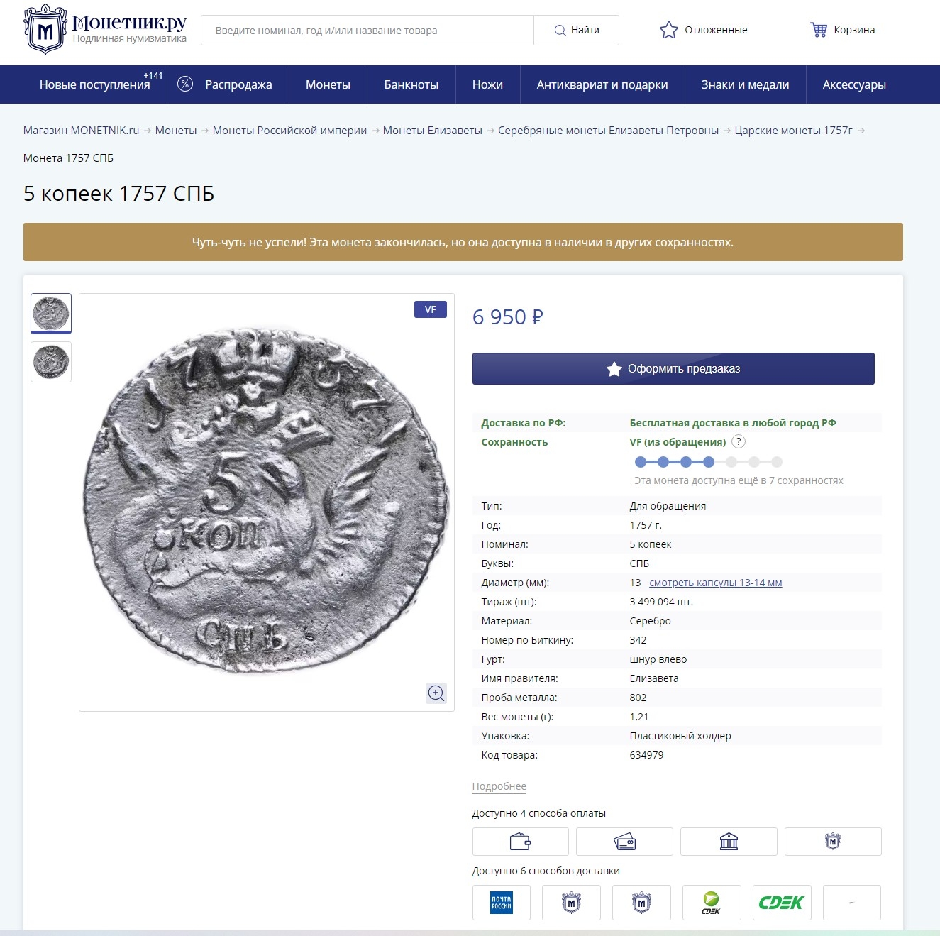 Монета номиналом 5 копеек 1757 года, отчеканенная в период правления императрицы Елизаветы Петровны. Оригинальные монеты этого типа чеканились из меди на Санкт-Петербургском монетном дворе. Данный экземпляр является подделкой, о чём прямо указано в описании поста.