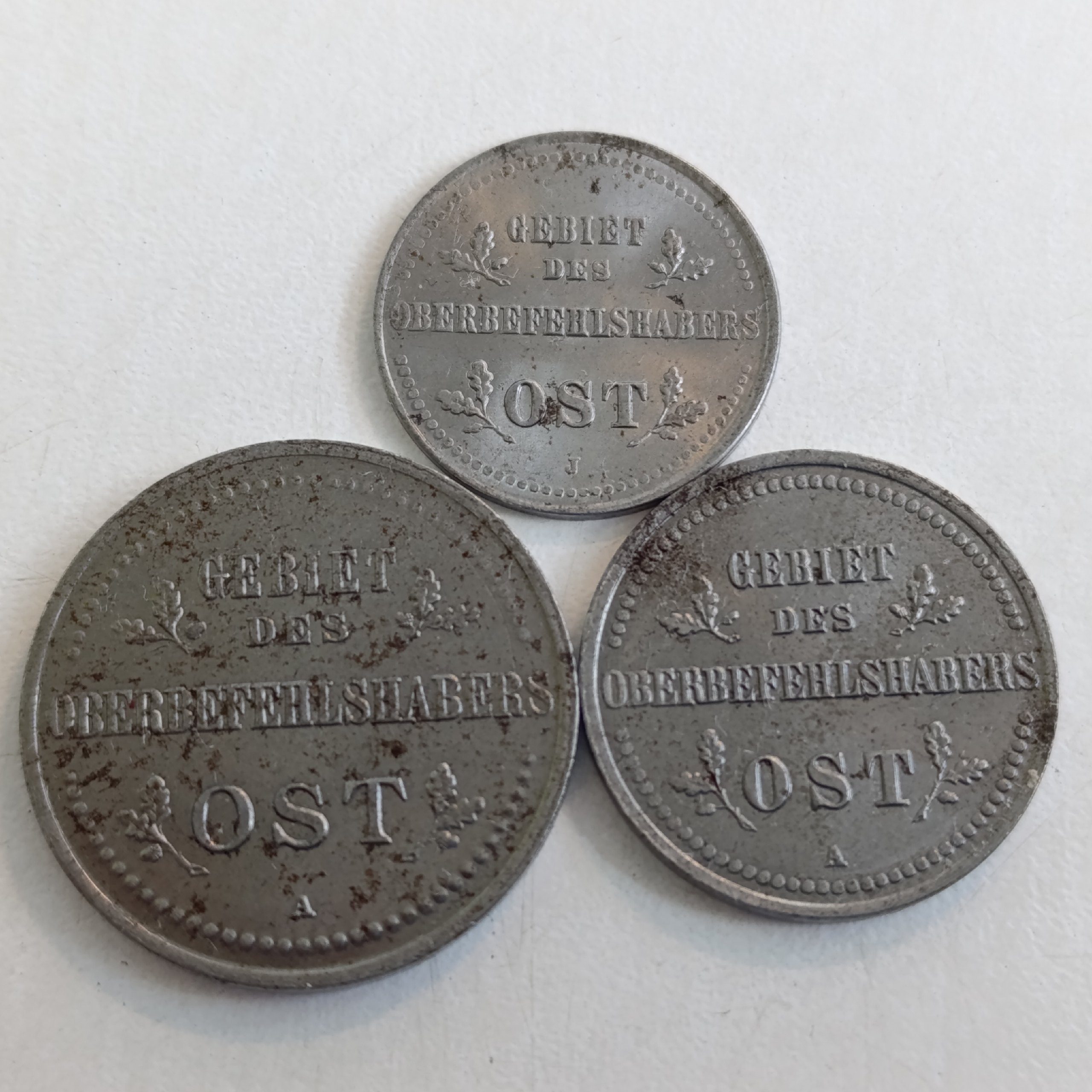 Представлены монеты номиналом 1, 2 и 3 копейки 1916 года, отчеканенные для оккупированных территорий в Первую мировую войну (1 копейка — Гамбург, 2 и 3 копейки — Берлин). Несмотря на правильные атрибуты, большинство экспертов сомневается в их подлинности из-за подозрительного блеска, зализанности гурта и отсутствия данных о весе, что характерно для современных копий.