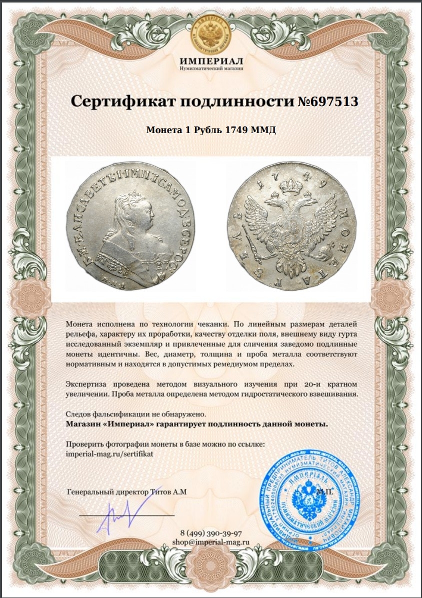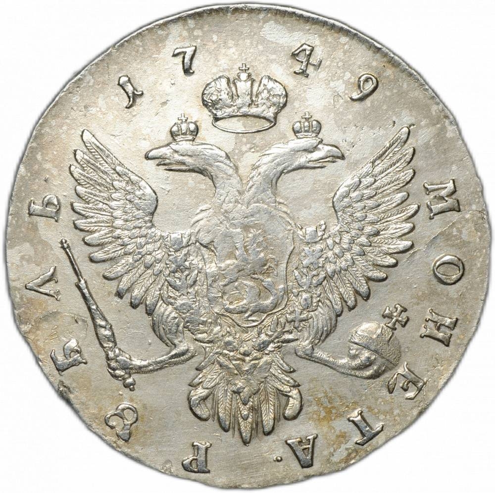Монета представляет собой копию серебряного рубля 1749 года, отчеканенного при императрице Елизавете Петровне на Московском монетном дворе (ММД). В оригинале это редкая и ценная монета, однако представленный экземпляр является современной подделкой, о чём прямо указано в посте. Подобные копии часто изготавливаются для коллекционеров-новичков или в сувенирных целях.