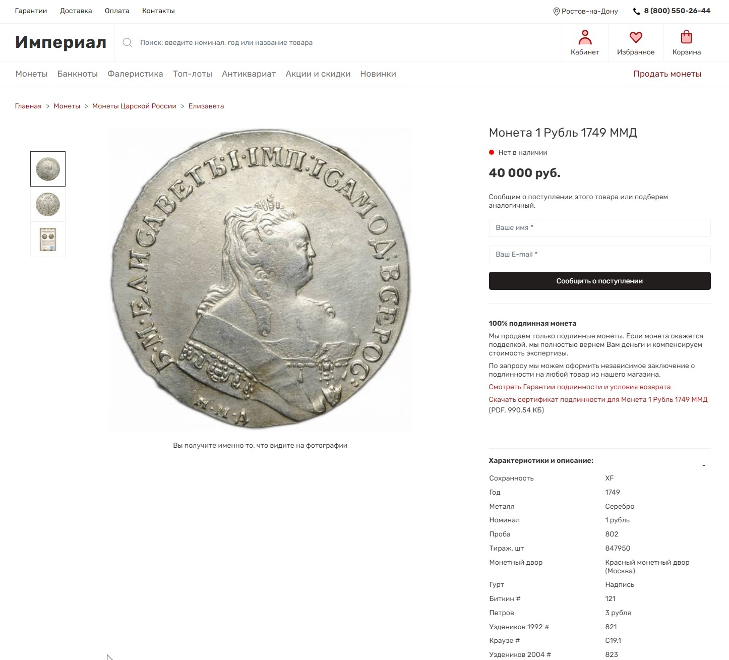 Рубль 1749 года Елизаветы Петровны — современная подделка