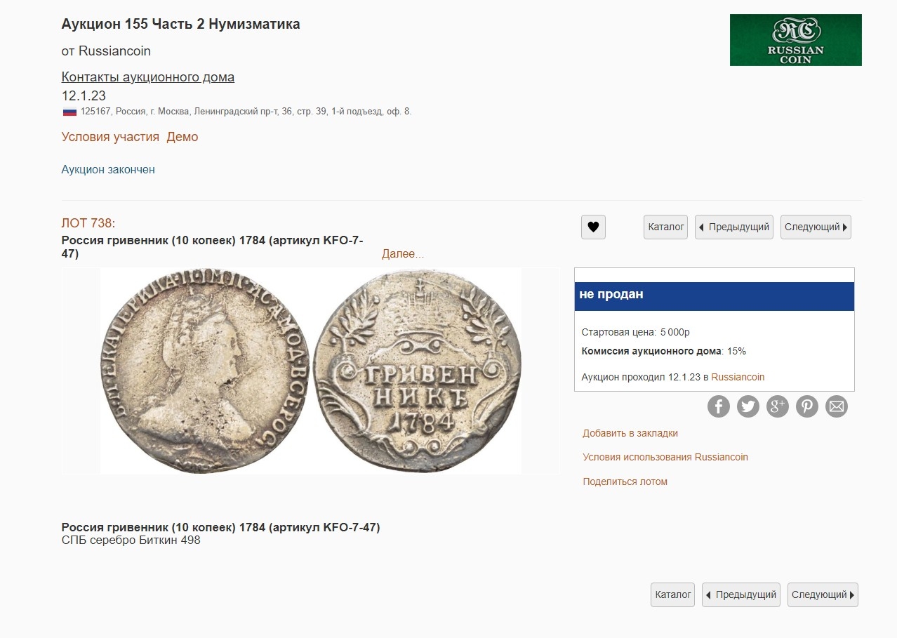 Гривенник 1784 года — поддельная монета Екатерины II