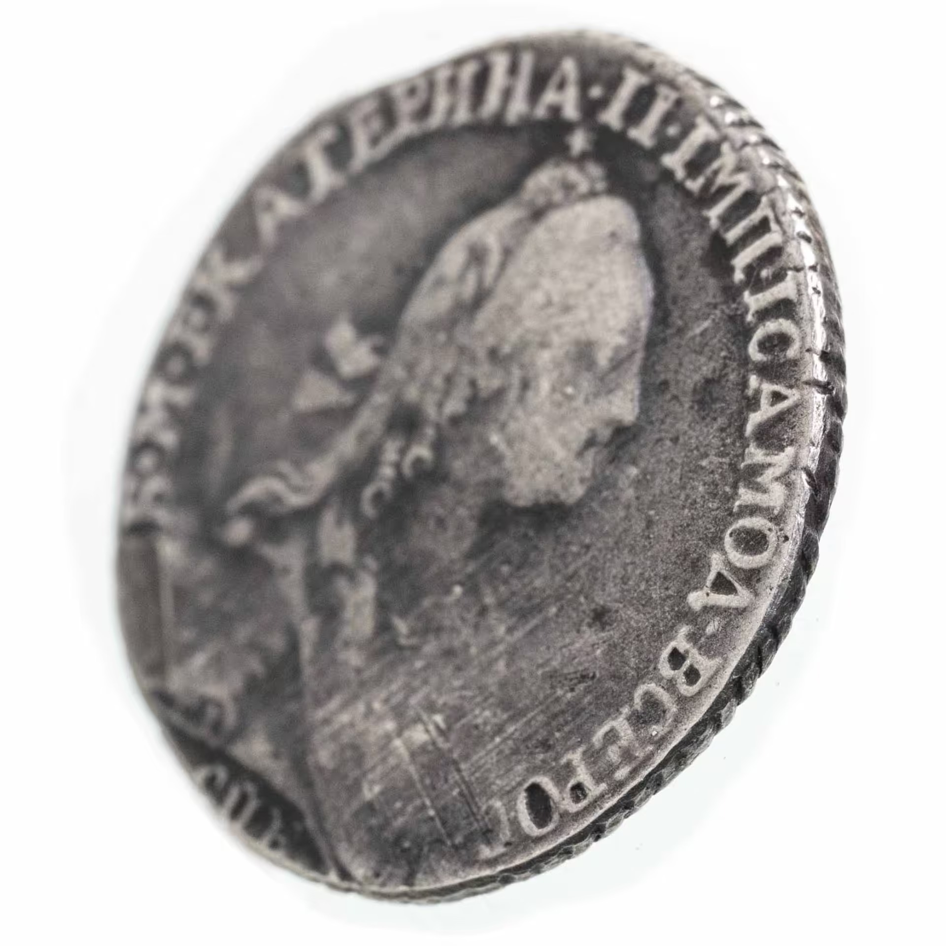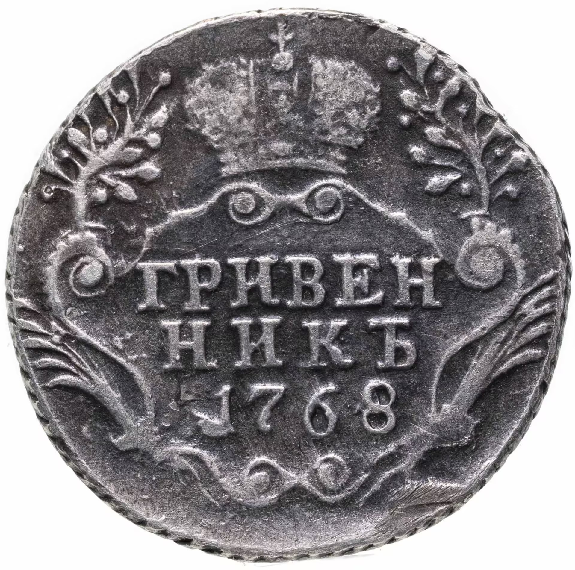 Монета представляет собой гривенник (10 копеек) времён правления Екатерины II, отчеканенный на Санкт-Петербургском монетном дворе в 1768 году. Оригинальные монеты этого периода имеют высокую коллекционную ценность. Однако представленный экземпляр является подделкой, о чём прямо указано в посте и подтверждается контекстом комментариев.