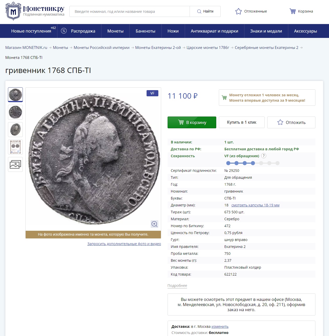 Гривенник 1768 года СПБ — поддельная монета Екатерины II