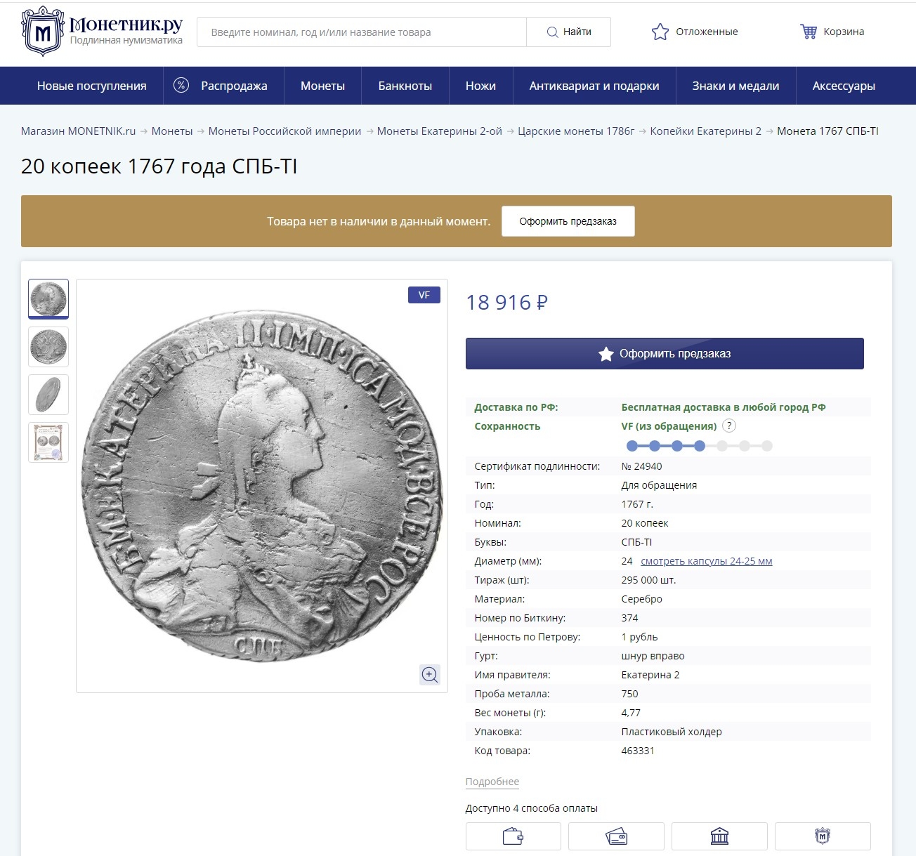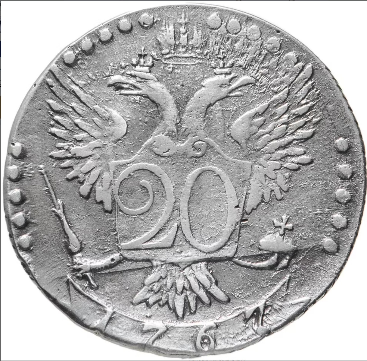 20 копеек 1767 года СПБ — поддельная монета Екатерины II