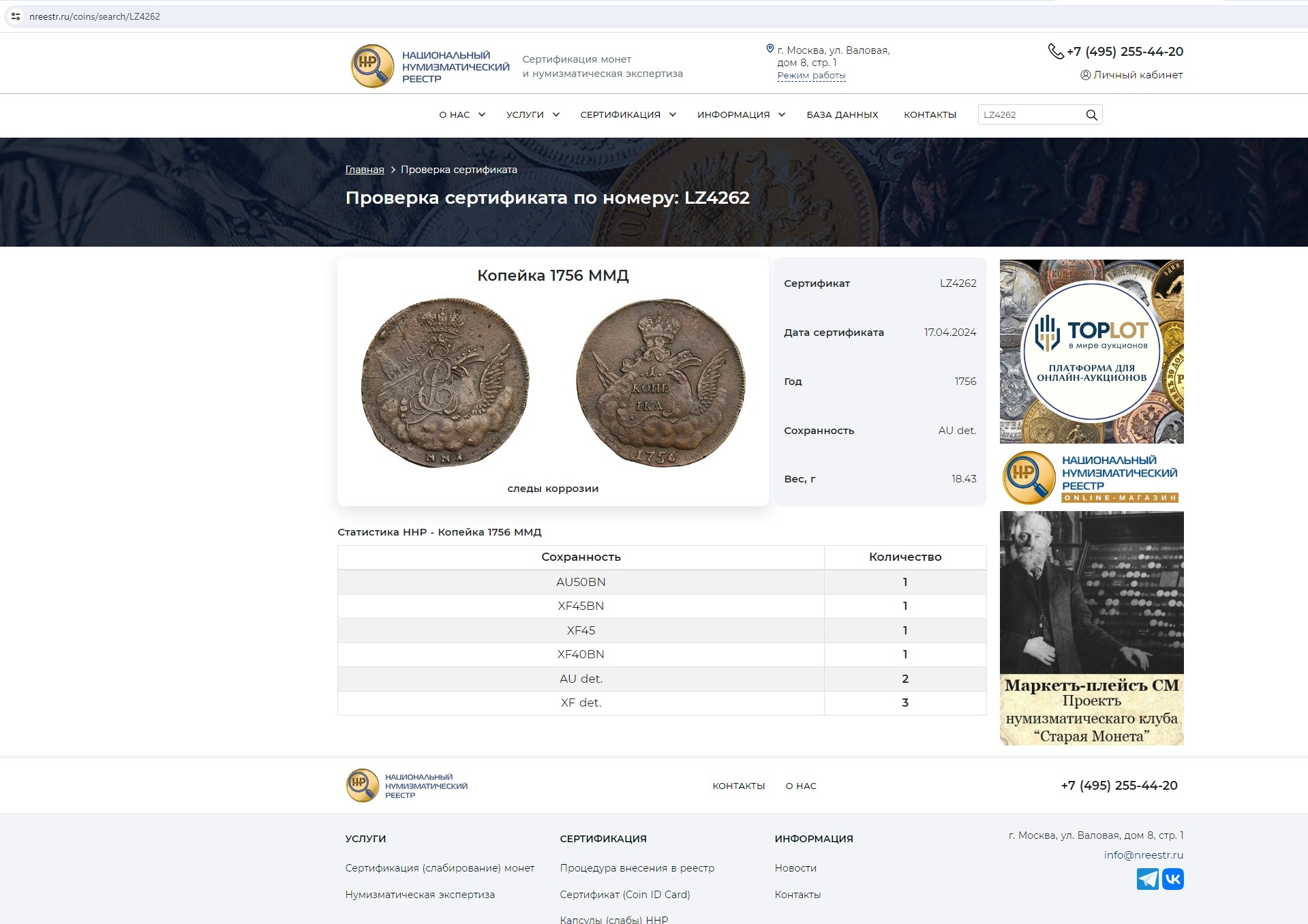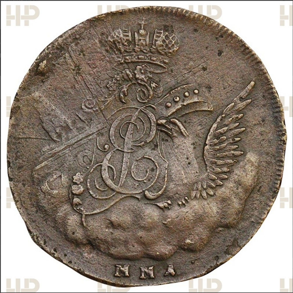 Медная 1 копейка 1756 года, отчеканенная на Московском монетном дворе (ММД) в период правления императрицы Елизаветы Петровны. Монета была дважды отправлена на грейдинг в компанию ННР и получила сертификаты под номерами LZ4262 и SZ3759, которые впоследствии были отозваны и помечены как «Подделка». Это пример высококачественной фальшивки, введшей в заблуждение даже профессиональные службы аутентификации.