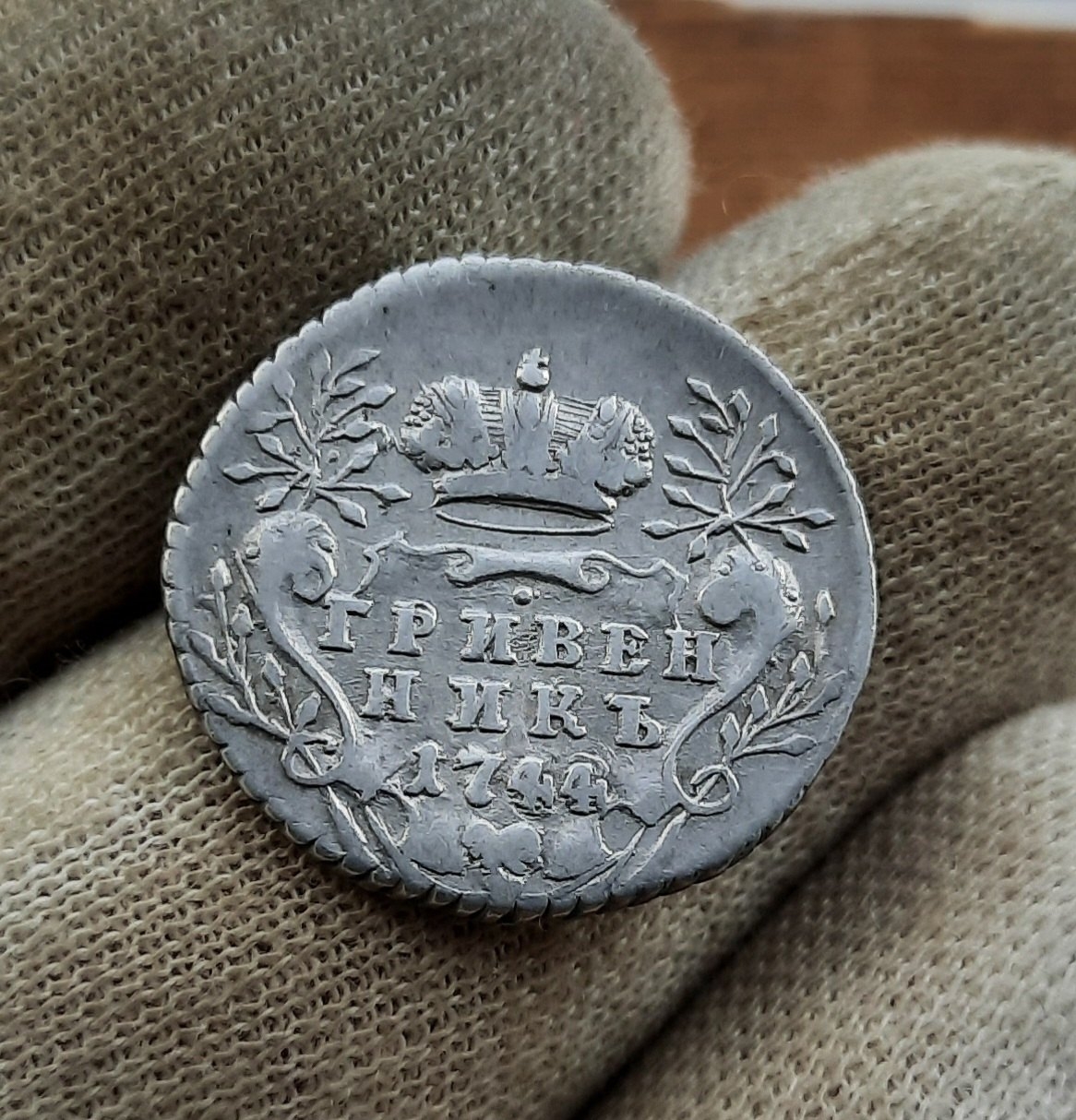 Серебряный гривенник 1744 года, отчеканенный в период правления императрицы Елизаветы Петровны. Монета имеет стандартные параметры для данного номинала и периода. На основе консенсуса в комментариях сообщества, монета признана подлинной (оригиналом).