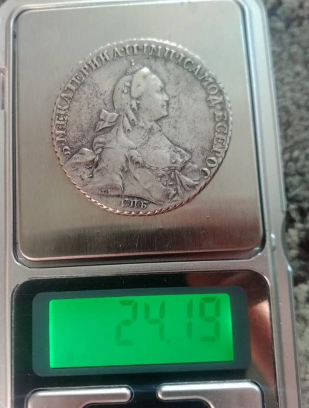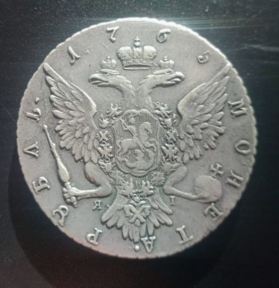 Серебряный рубль 1765 года с портретом императрицы Екатерины II, относящийся к так называемому «Плосконосому» типу портрета. Монета признана подлинной большинством комментаторов, её вес и детали соответствуют оригиналу. Несмотря на отдельные сомнения в комментариях, консенсус экспертного сообщества склоняется в пользу оригинала.