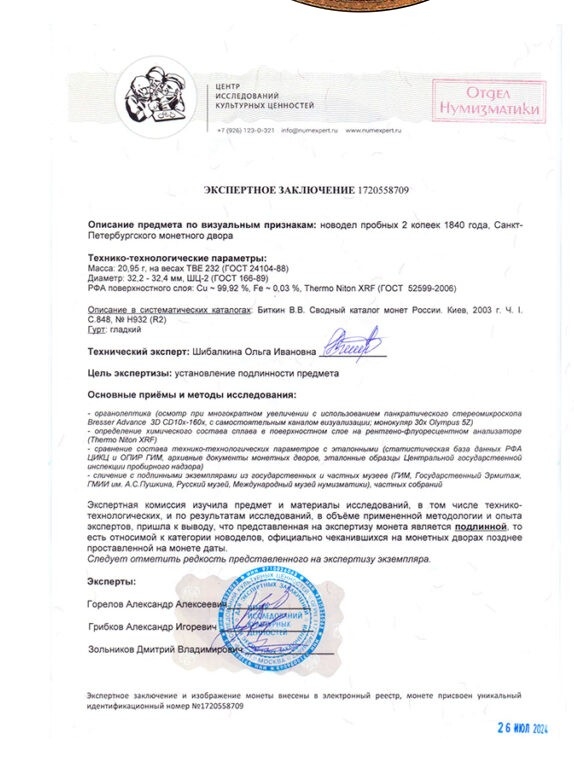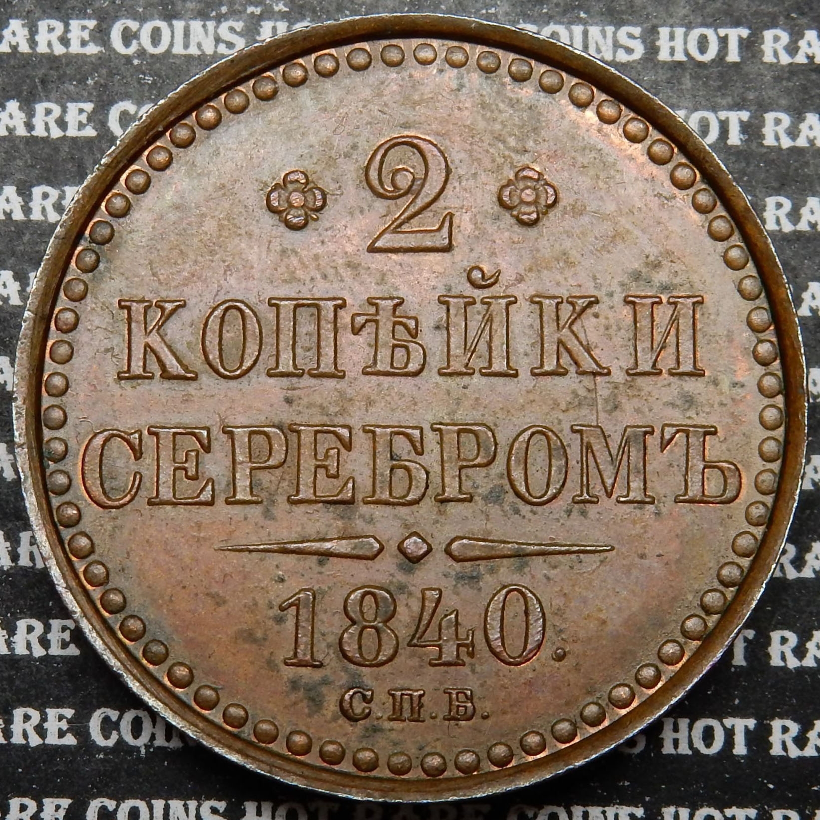 Медная монета номиналом 2 копейки 1840 года с обозначением Санкт-Петербургского монетного двора (СПБ). Несмотря на внешнее сходство с оригиналом, является качественной подделкой, что подтверждено официальным заключением Центра исследований и коллекционирования (ЦИКЦ). Данный экземпляр — яркий пример современной фальсификации, имитирующей подлинные монеты эпохи Николая I.