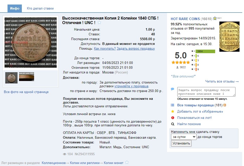 1. Продажа монеты происходит в 2023 году. Продавец, возможно, сам не знает, что у него оригинал. А ввиду отличного состояния, для перестраховки написал в названии лота "отличная копия".