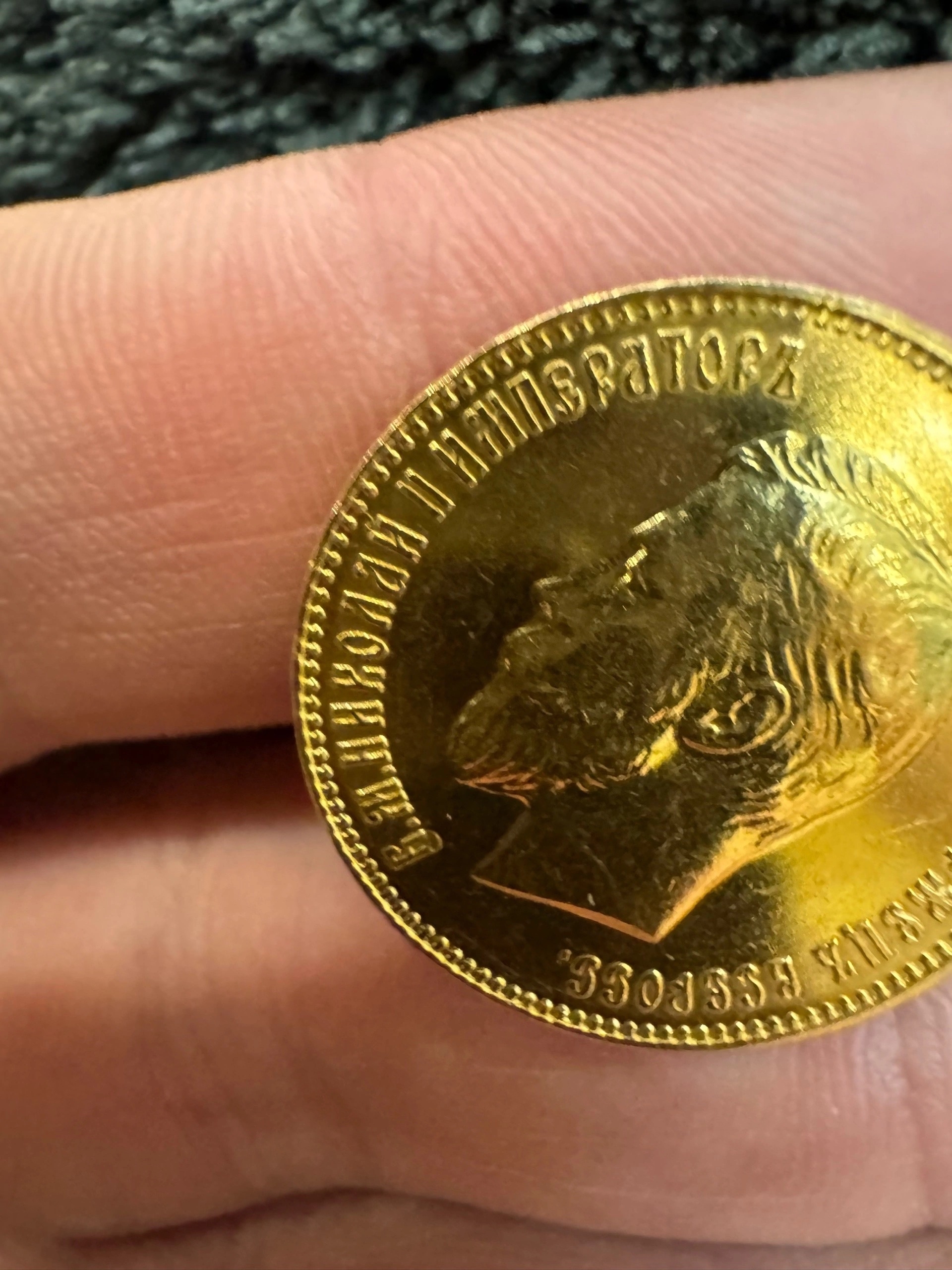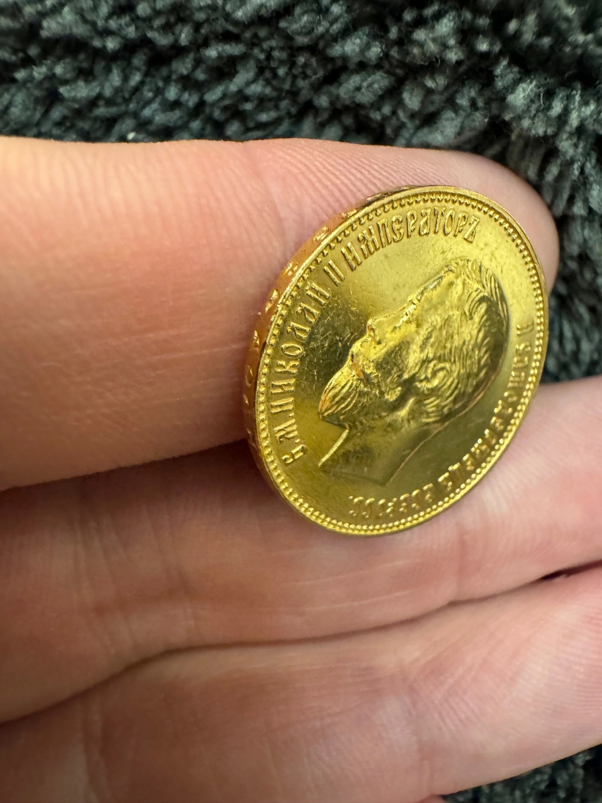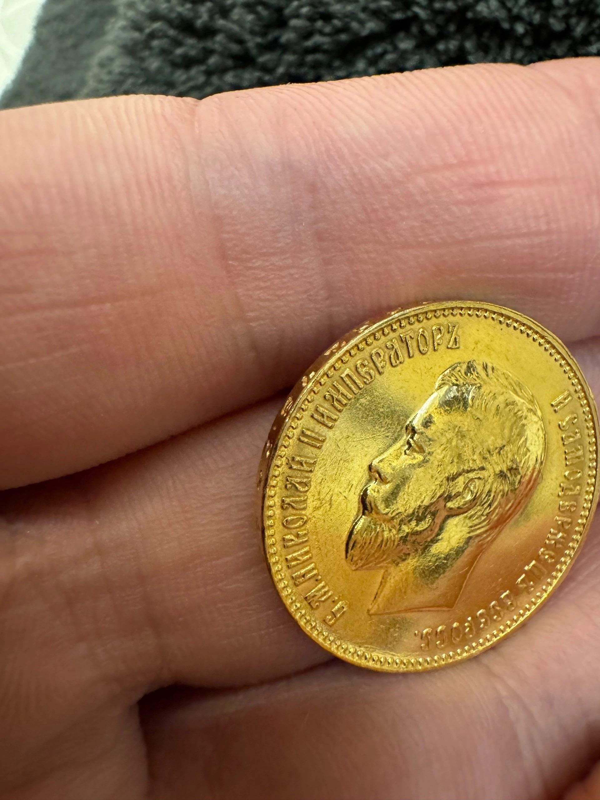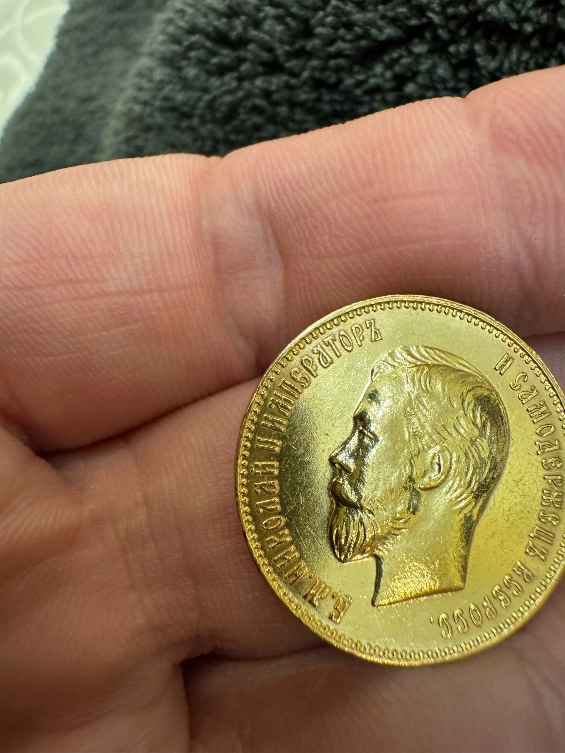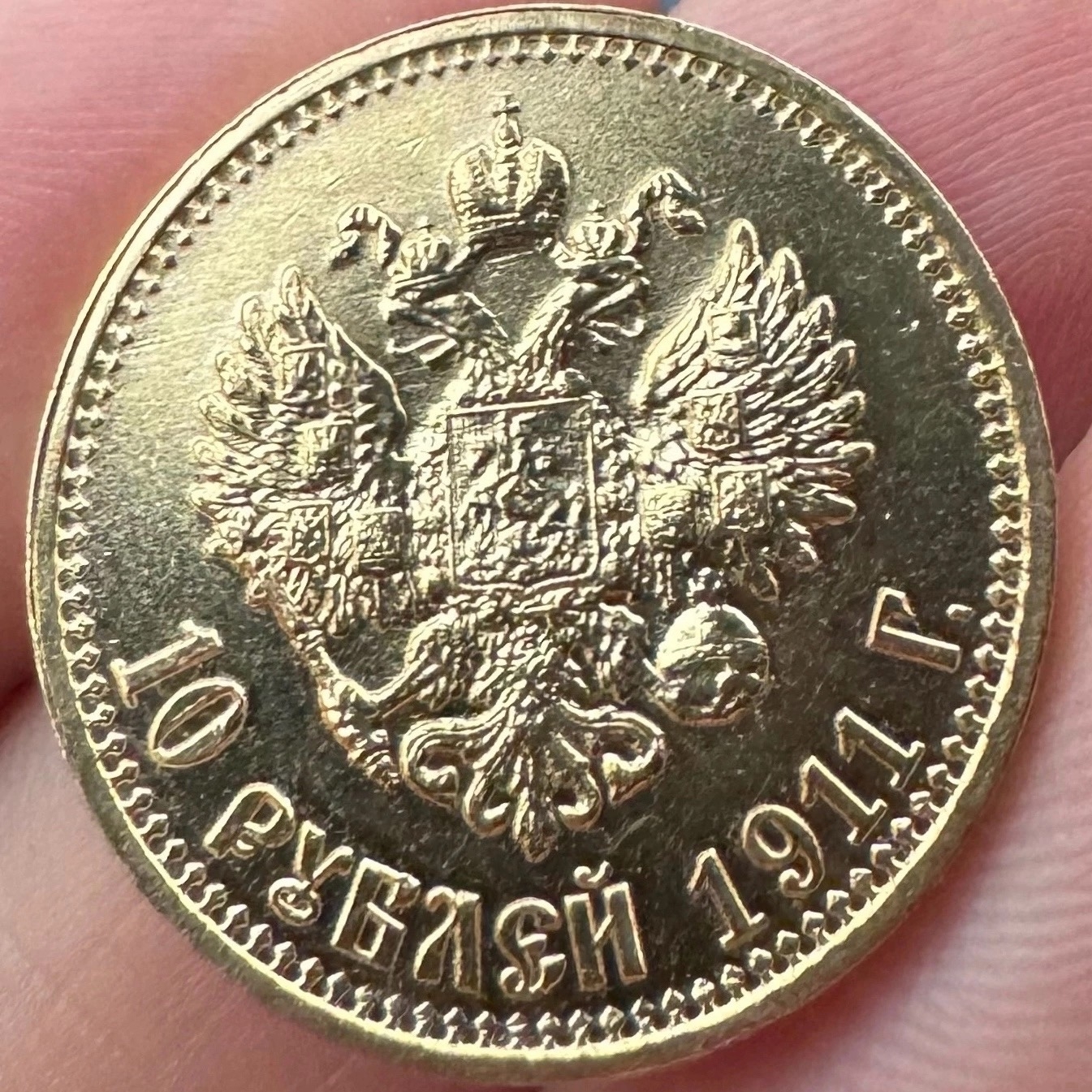 Монета 10 рублей 1911 года, отчеканенная при Николае II, является одной из самых известных золотых монет Российской Империи. Представленный экземпляр, судя по консенсусу экспертов, является подделкой — либо сувенирной копией, либо поздним «допечатком» советского времени. На это указывают расхождения в деталях штемпеля, возможное литьё и несоответствие веса оригиналу (8.6 г против 8.6 г чистого золота у подлинника).