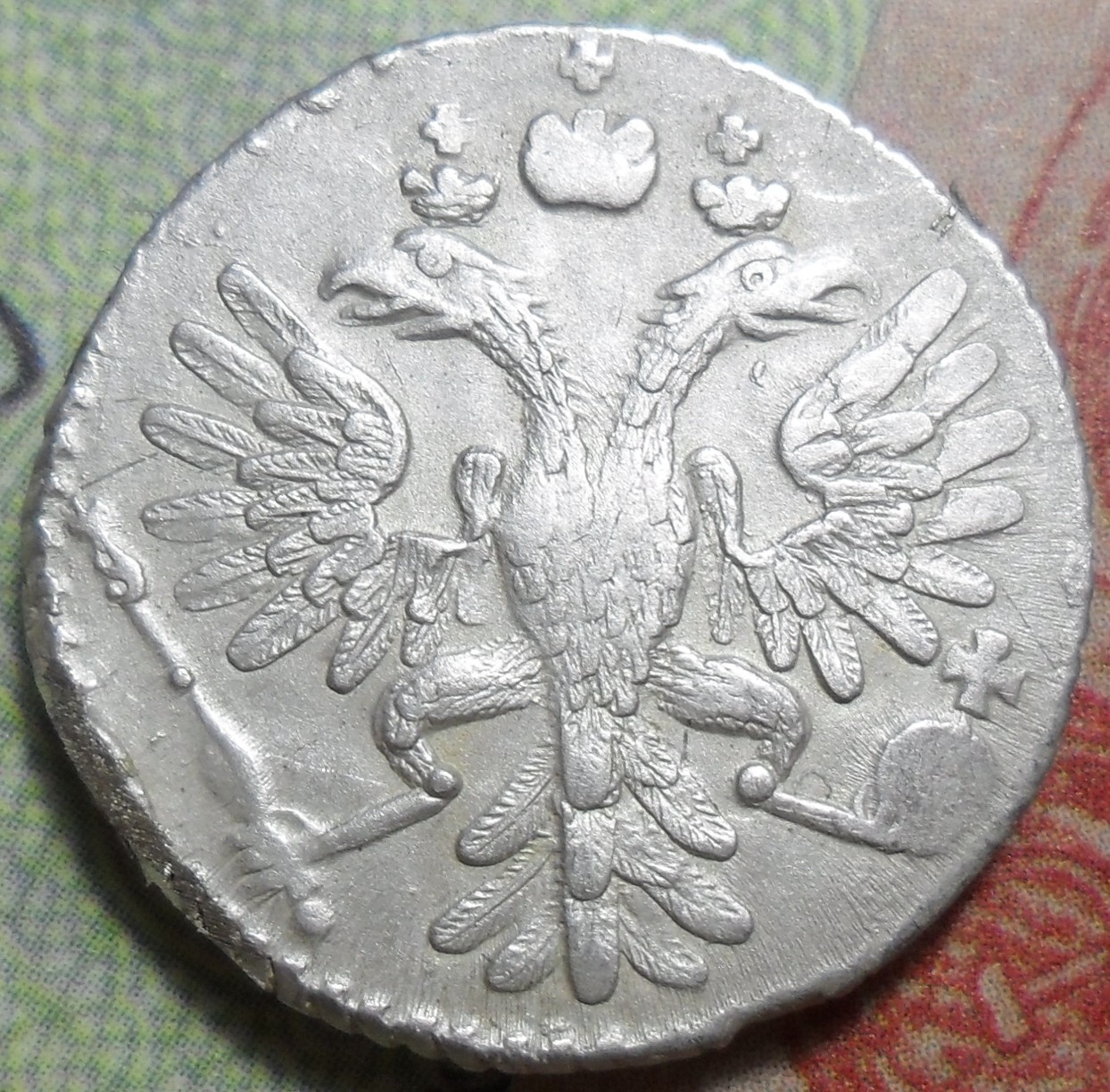 Монета представляет собой копию серебряного гривенника (10 копеек) времён правления императрицы Анны Иоанновны, отчеканенного в 1733 году. Оригинальные монеты этого типа имеют высокую коллекционную ценность. В посте прямо указано, что это копия, что делает её современной репликой, не имеющей нумизматической ценности.