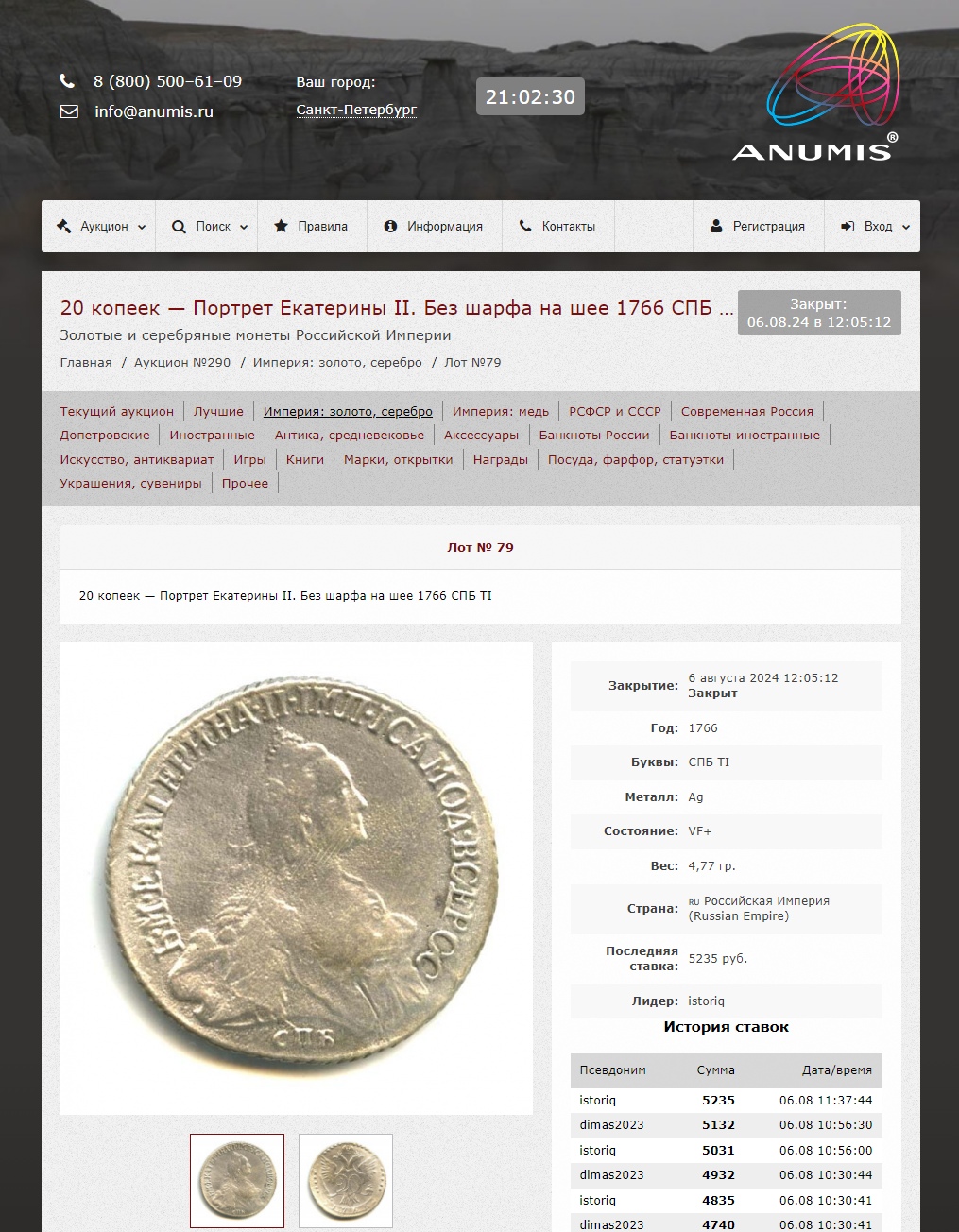 20 копеек 1766 года СПБ — поддельная монета Екатерины II