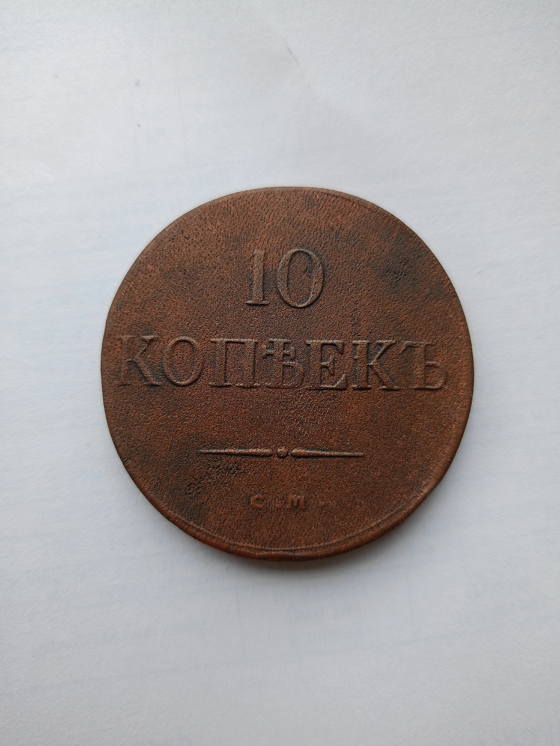 Монета 10 копеек 1831 года, отчеканенная при императоре Николае I из серебра. Представленный экземпляр является фальшивкой, о чём свидетельствуют грубые дефекты поверхности, характерные для литья. Подобные копии часто изготавливаются для обмана коллекционеров.