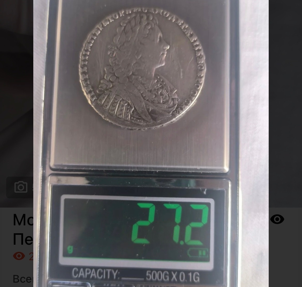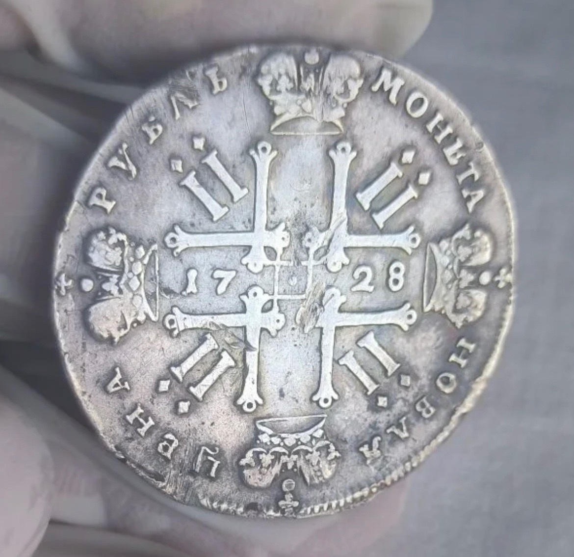 Серебряный рубль 1728 года, отчеканенный в правление императора Петра II. Монета этого периода имеет высокую коллекционную ценность и является частым объектом подделок. Определить её подлинность по единственному фото без детальных комментариев экспертов невозможно.