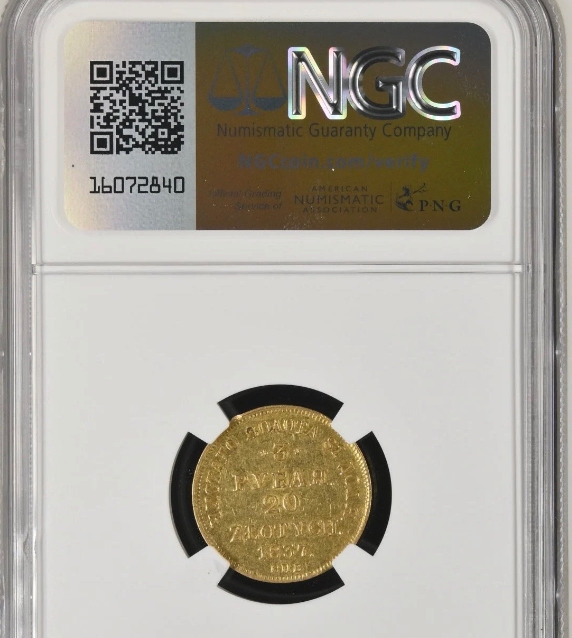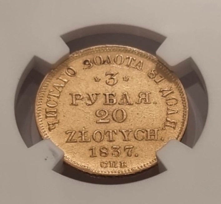 Монета 3 рубля / 20 злотых 1837 года (СПБ-ПД) отчеканена в период правления Николая I. Это серебряная монета двойного номинала для обращения в Царстве Польском. Определить её подлинность по фотографиям в пластиковом слабе (сертифицированном держателе) крайне сложно, что и вызвало споры среди экспертов.