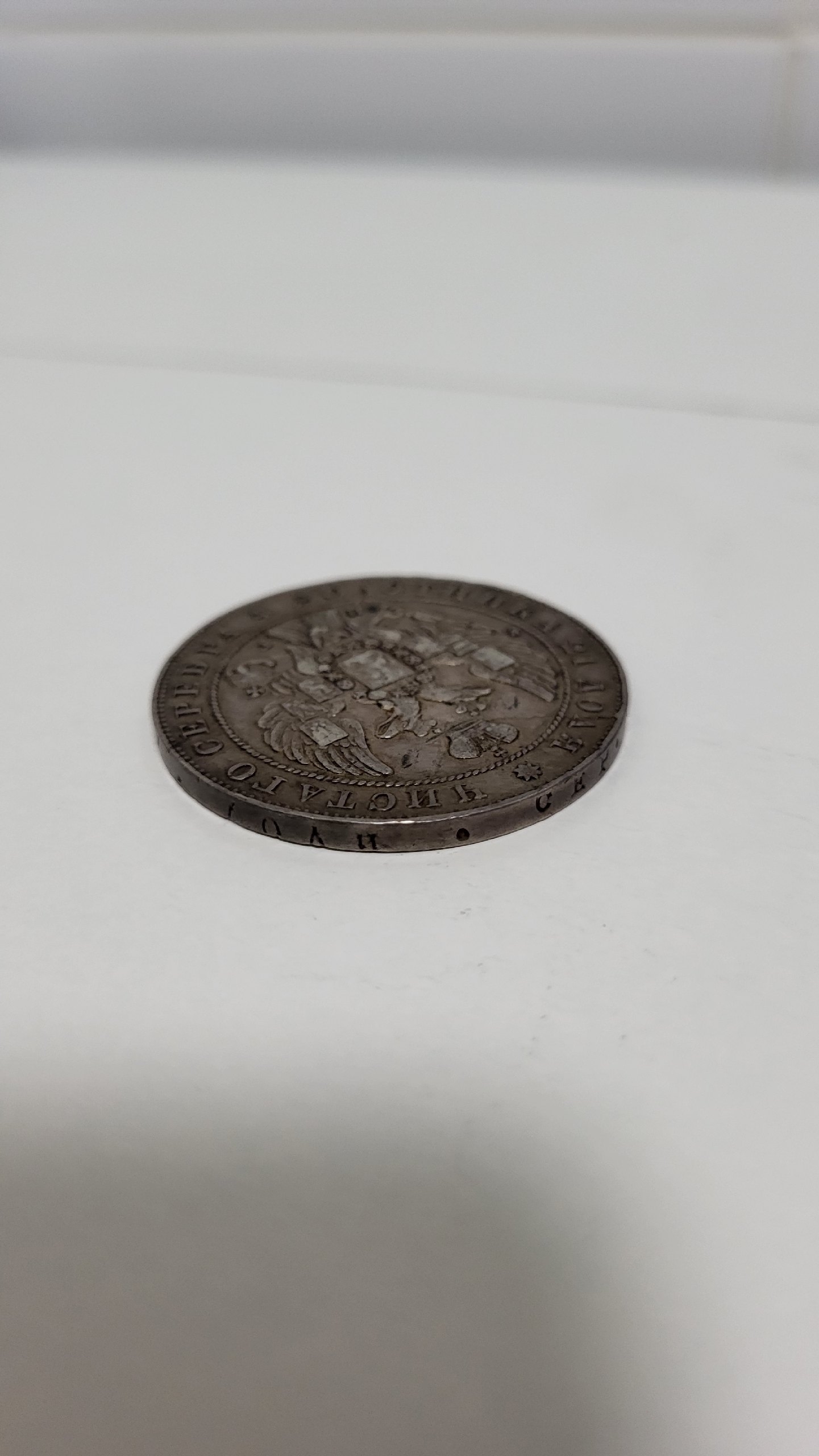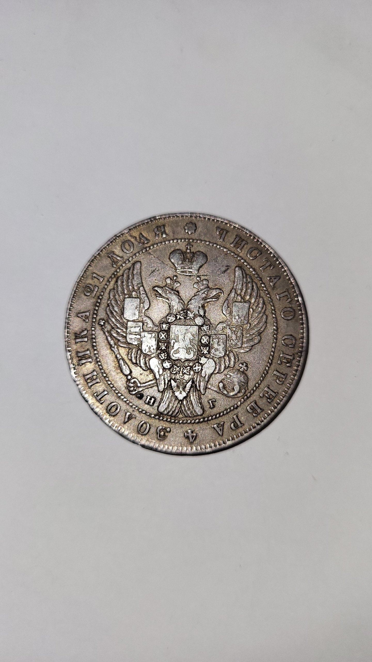 Серебряный рубль 1840 года, отчеканенный в правление императора Николая I. Монета относится к так называемому периоду «кривых букв», для которого характерны несовершенства в написании легенды, что является технологической особенностью оригинальной чеканки того времени. Комментарии экспертов единогласно подтверждают подлинность данного экземпляра.