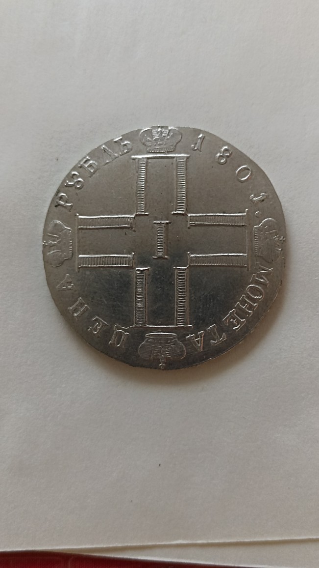 Монета представляет собой рубль 1801 года, отчеканенный в начале правления императора Александра I. Однако, судя по консенсусу в комментариях, это современная подделка. Эксперты отмечают кривой крест на реверсе и общее низкое качество исполнения, характерное для сувенирных копий.