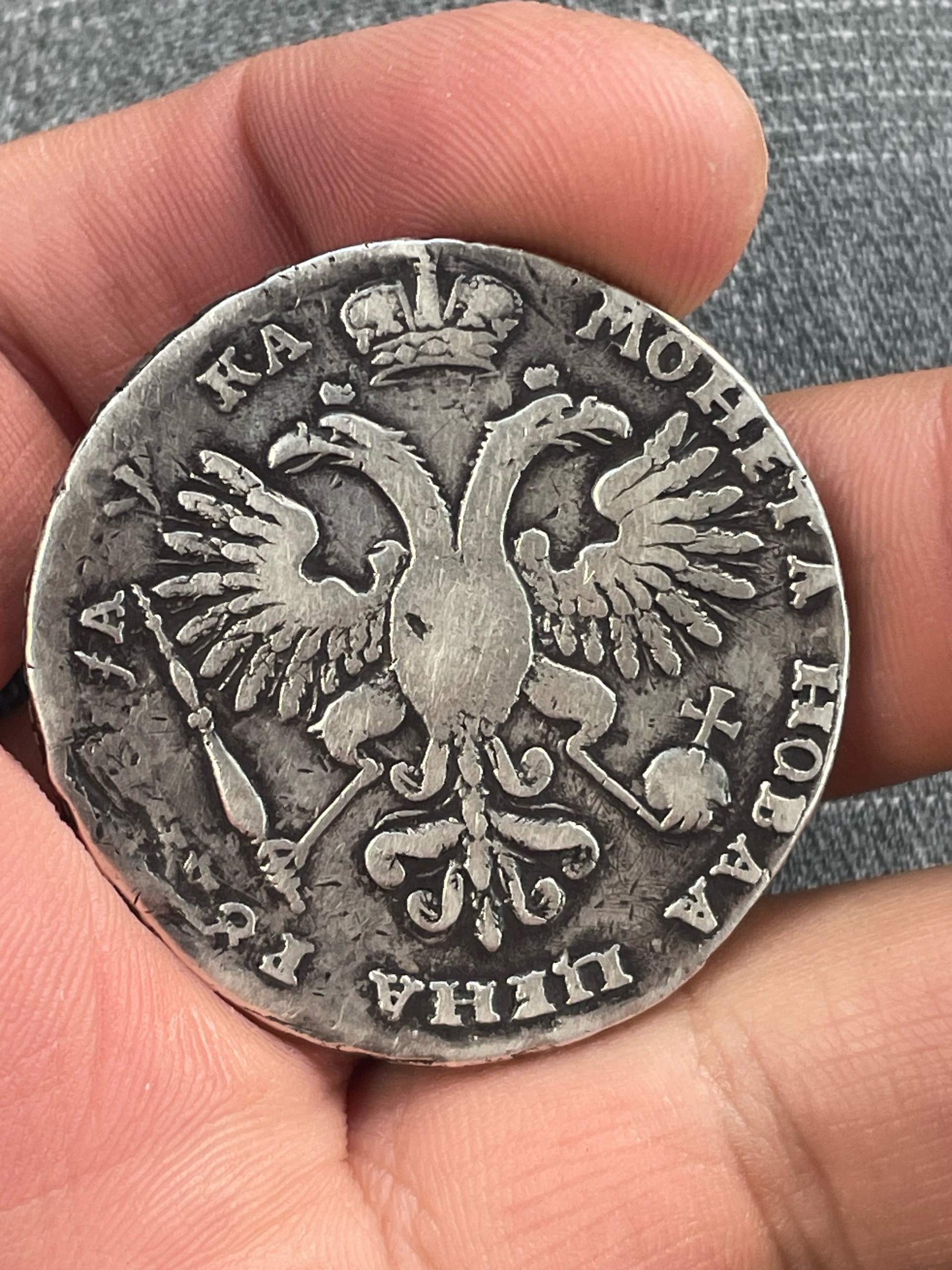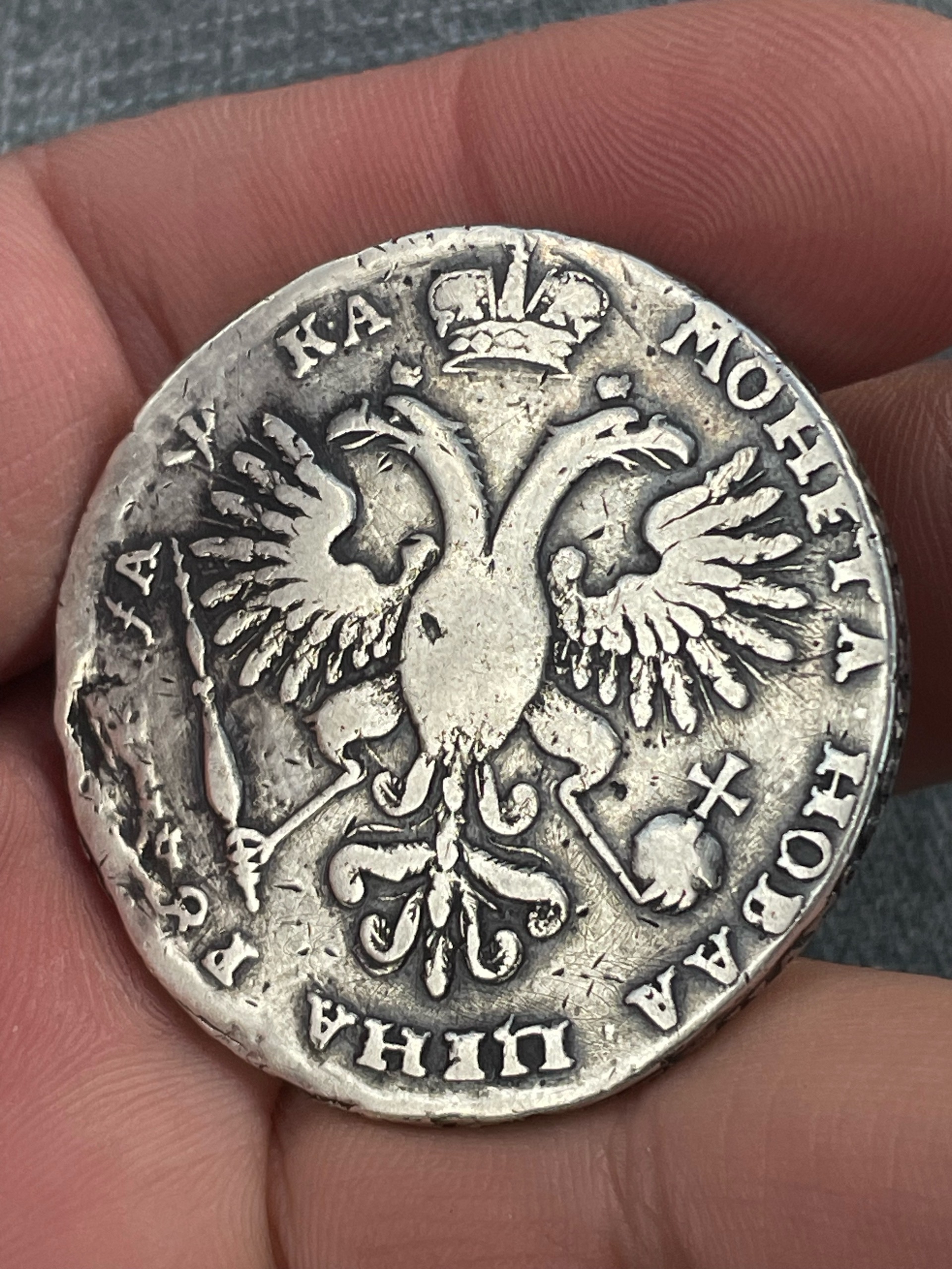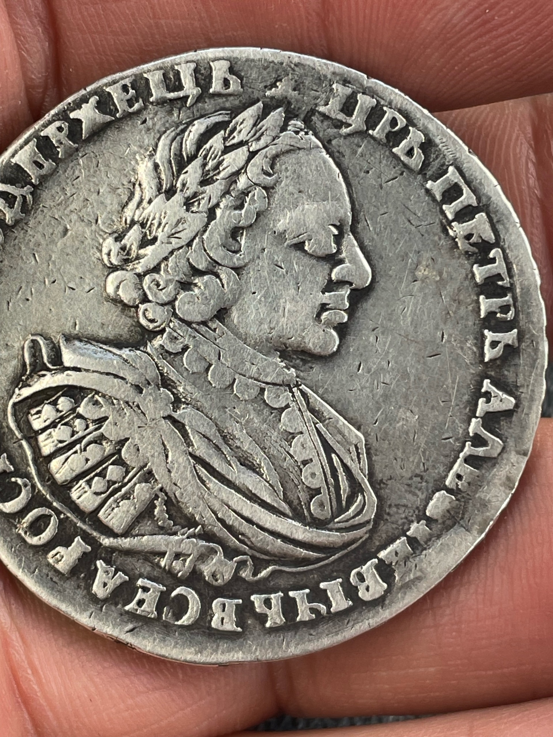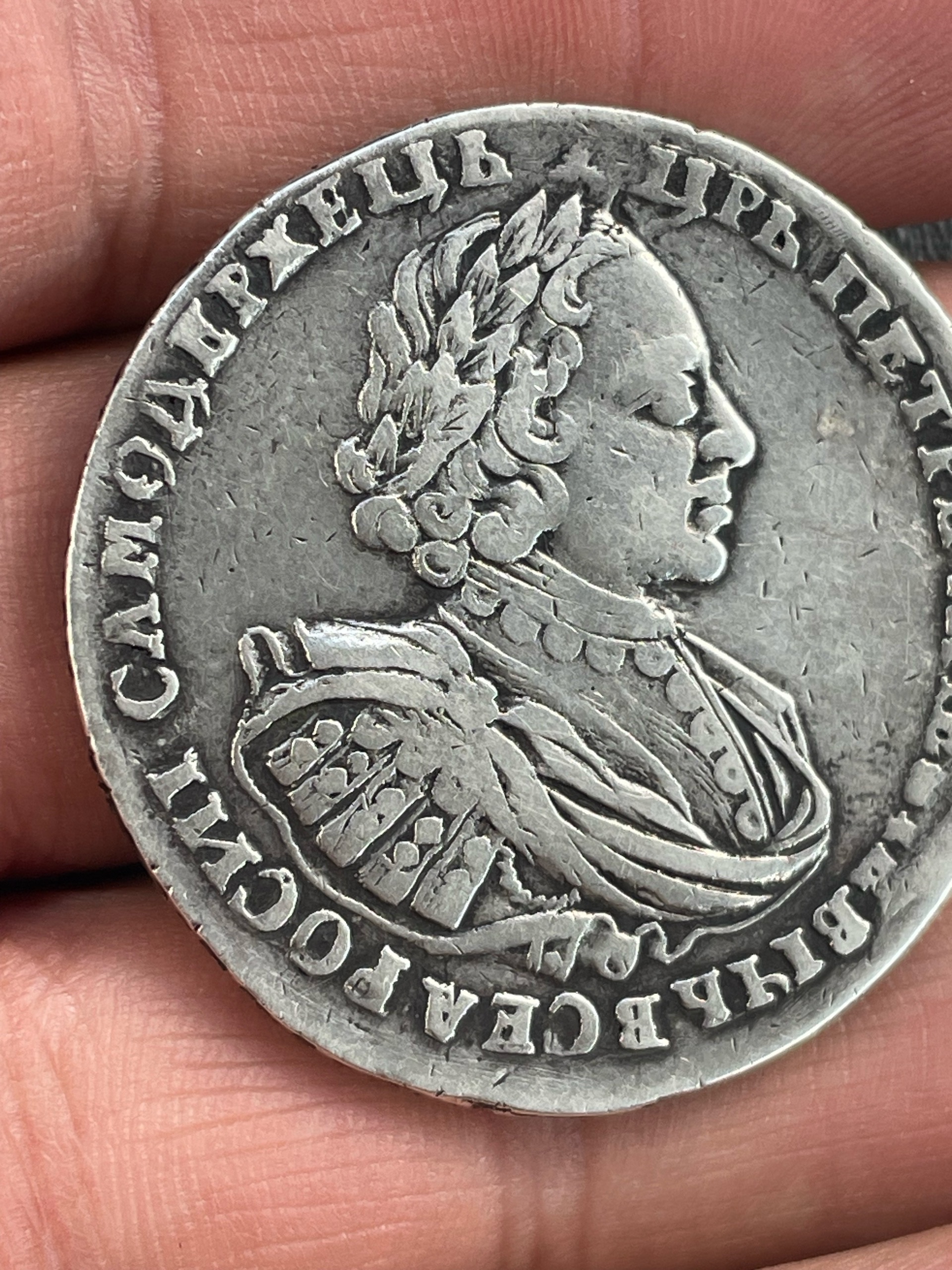 Серебряный рубль 1721 года, отчеканенный в правление Петра I. Монета имеет следы бытования и возможной реставрации, что характерно для подлинных экземпляров такого возраста. Судя по консенсусу экспертов в комментариях, монета является оригиналом, несмотря на свой почтенный возраст.