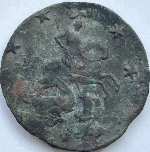 Медная монета номиналом 4 копейки, отчеканенная в 1762 году в период краткого правления императора Петра III. Монета имеет характерный для того времени дизайн с вензелем императора и гербовым орлом. Судя по консенсусу экспертов в комментариях, монета является подлинной, о чём свидетельствует естественная патина и правильные детали чеканки.