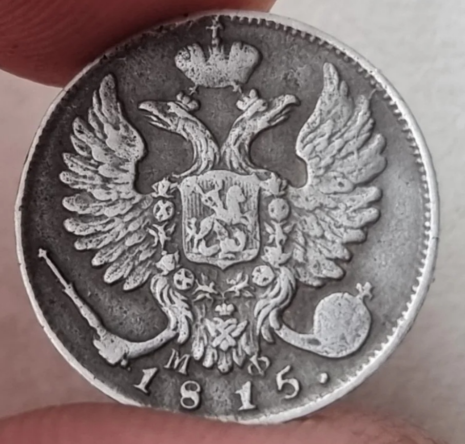 Монета номиналом 10 копеек 1815 года, отчеканенная при императоре Александре I на Санкт-Петербургском монетном дворе (обозначение «СПБ»). В исходном посте автор прямо указал, что это копия, что автоматически классифицирует её как неоригинальный экземпляр, созданный для коллекционеров или в сувенирных целях.