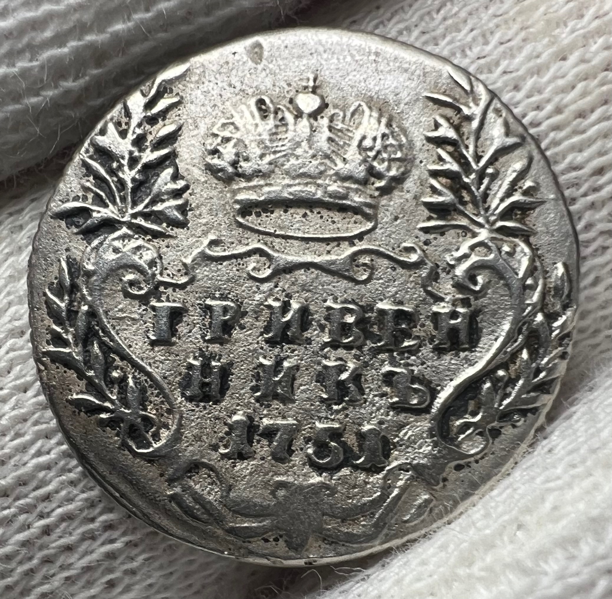 Монета представляет собой гривенник (10 копеек) времён правления императрицы Елизаветы Петровны, отчеканенный в 1751 году. Оригинальные монеты этого периода изготавливались из серебра и имеют высокую коллекционную ценность. Представленный экземпляр является современной литой подделкой низкого качества, что легко определяется опытными нумизматами.