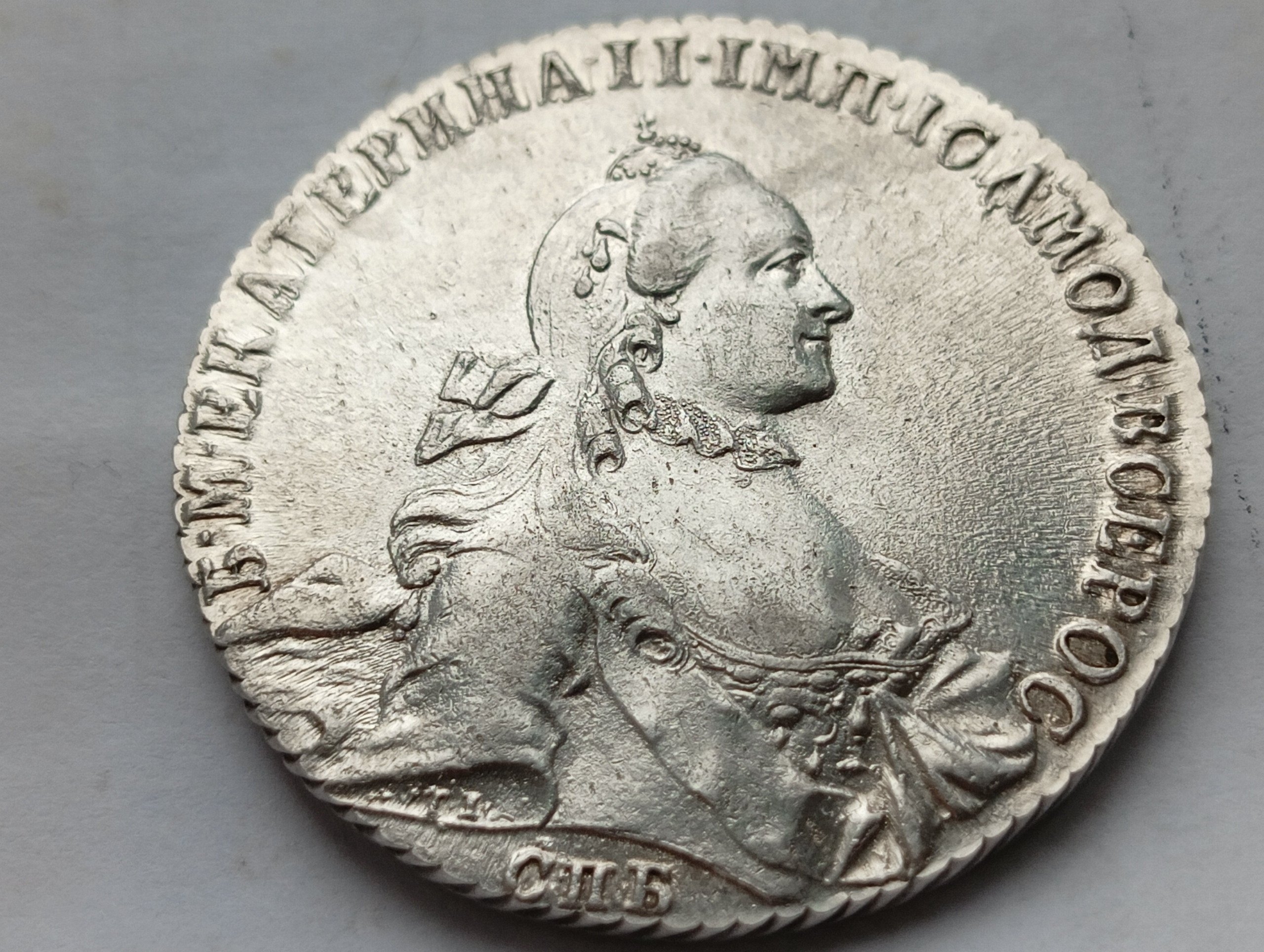 Монета представляет собой копию серебряного рубля 1764 года, отчеканенного при Екатерине II на Санкт-Петербургском монетном дворе (обозначение СПБ). Несмотря на внешнюю привлекательность, это подделка. Эксперты отмечают неестественную зернистость поля, подозрительный вид портрета и чрезмерный блеск, характерный для новоделов или литья.